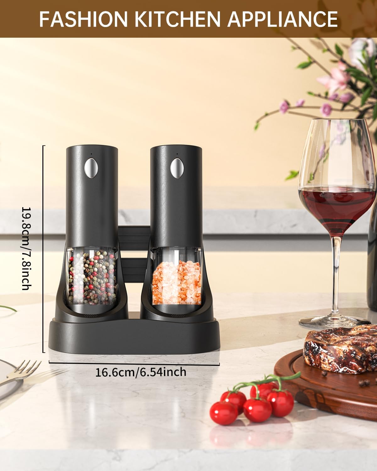 CIRCLE JOY Electric Salt and Pepper Grinder Set Automatic Salt and Pepper Grinder Set with Easy-to-Carry Charging Base and LED Light, Adjustable Coarseness, USB Rechargeable, Washable Container, Black