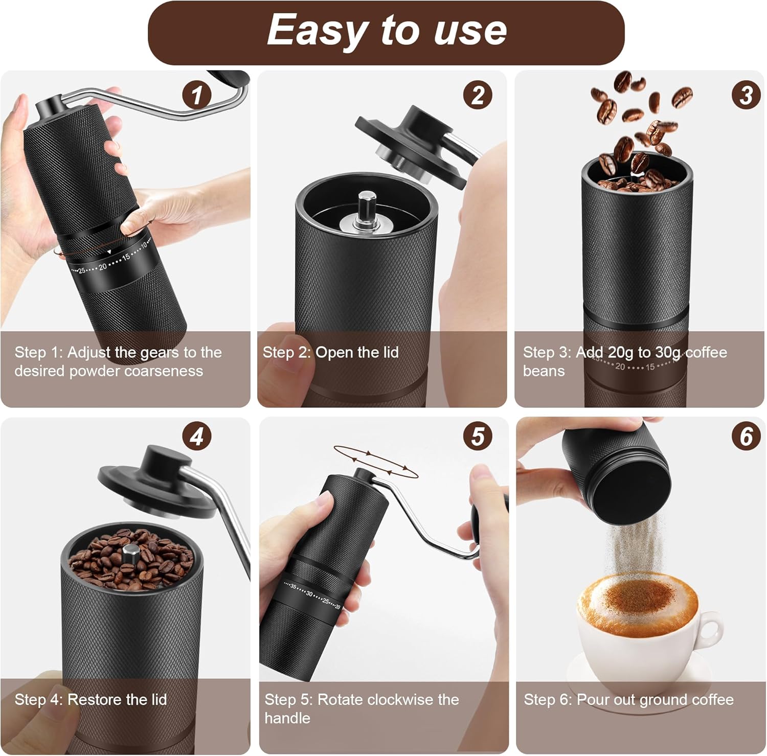 ERGONOMIC HANDLE: Time- and energy-saving manual grinding makes your coffee an enjoyable ritual. The maximum grinding capacity is 28g.