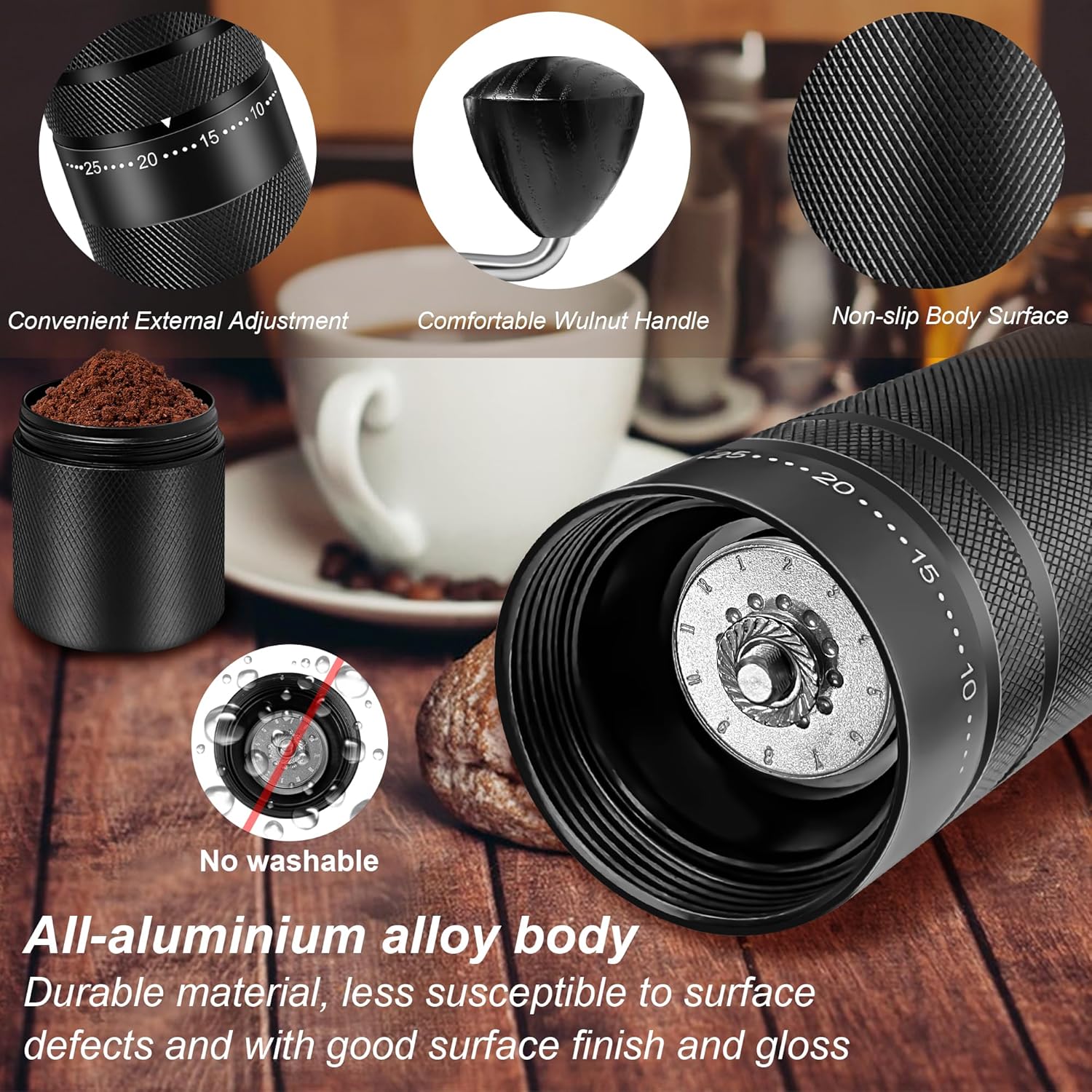 420 STAINLESS STEEL HEPTAGON BURR: The burr set design and the dual bearing design allow you for a better consistent grinding experience. The aluminum alloy material of the body grinder is more durable.