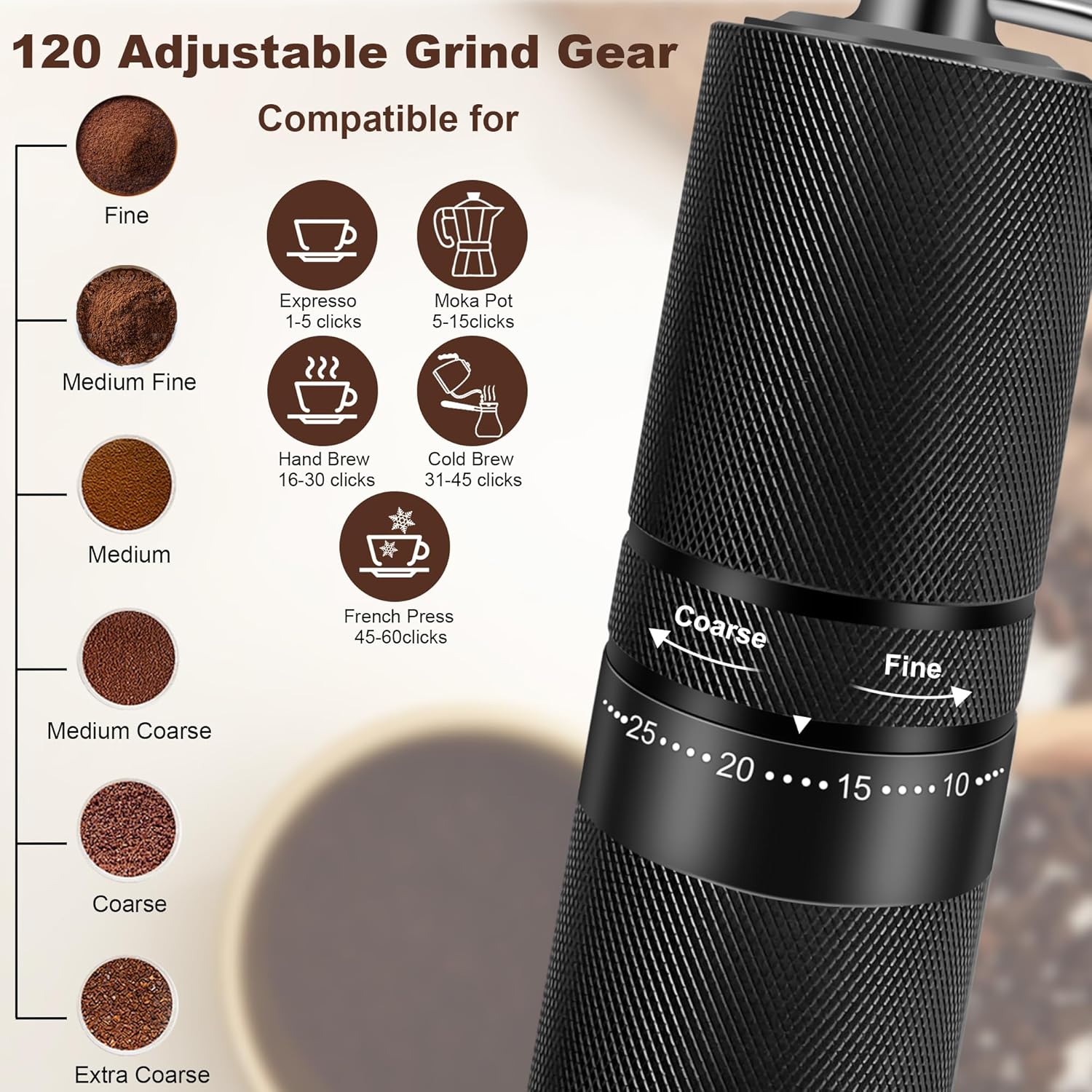 120 EXTERNAL ADJUSTMENT RING: With 2 adjustable circles, 60 clicks per circle. From very fine to extra coarse, it unlocks a bright and rich taste. (Turn right for fine grind, turn left for coarse grind)