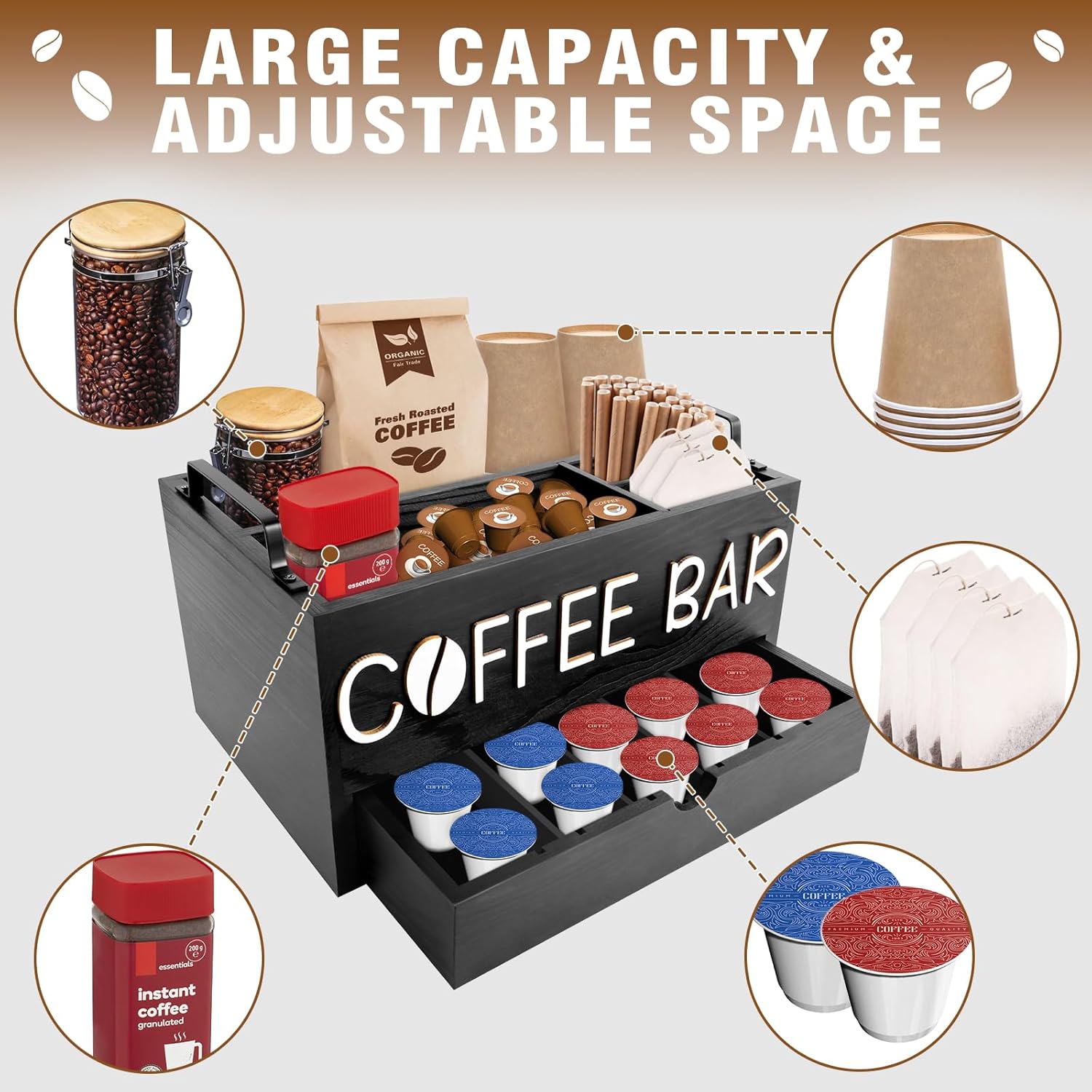 Generous Storage Space: With a small footprint and enough compartments to hold a wide range of coffee essentials from beans to cups, this coffee box organizer is ideal for a small office or cramped kitchen