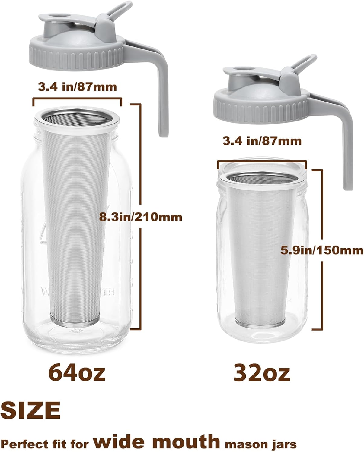 【Perfect Fit for Wide Mouth Mason Jars】 Designed to accommodate 64oz wide-mouth Mason jars(3.4 in/87mm), our filters and lid offer seamless compatibility. Experience the joy of hassle-free brewing in your preferred Mason jars, ensuring a snug fit and leak-free pouring