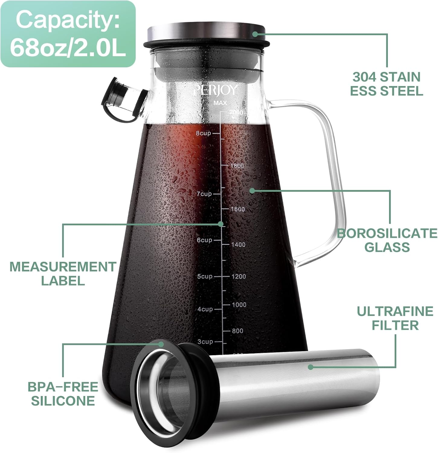 Multi Purpose Filters – 304 Stainless steel rust-free superfine laser cut filter & lid cap. That prevents coffee grounds from entering the pitcher jar, filters out large particles of coffee grounds to improve the taste of coffee, and can also be used to filter out fruit pits and tea leaves, making it easy to make iced tea and other beverages.