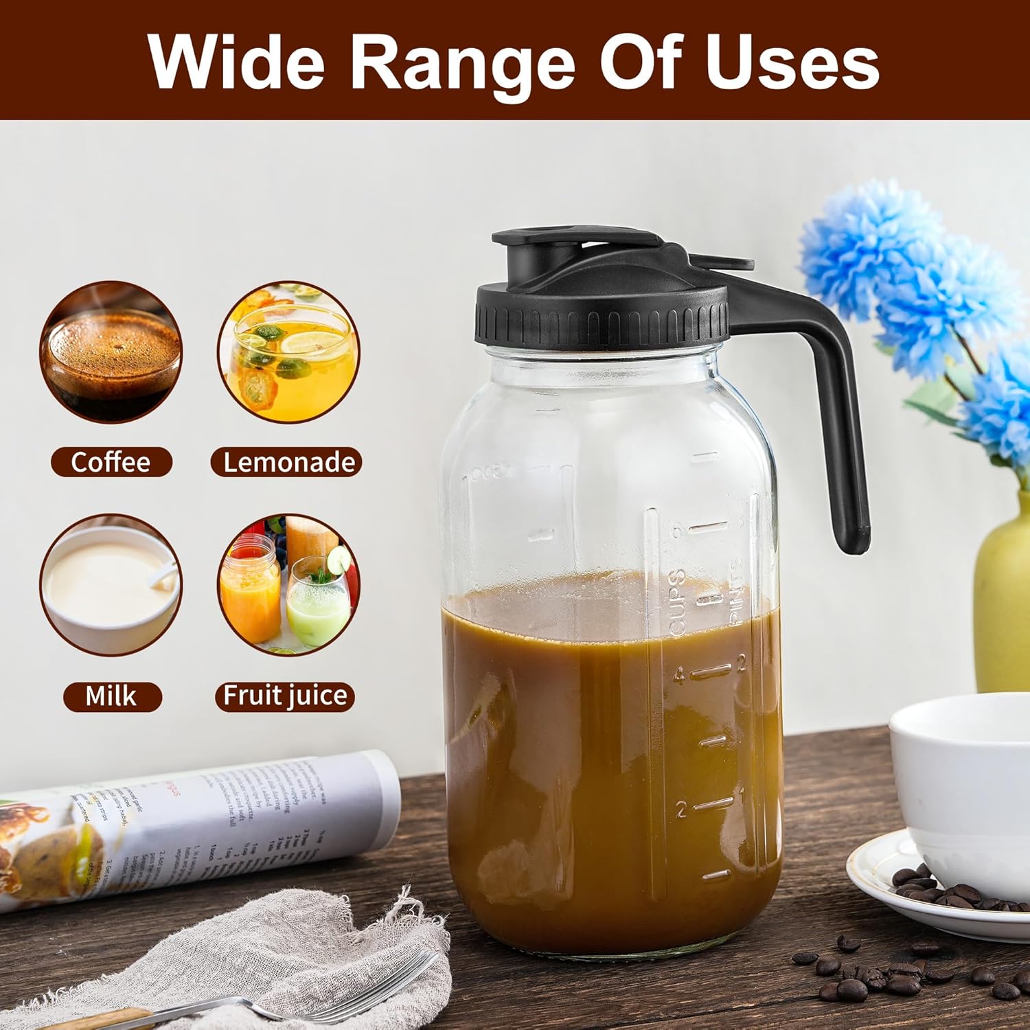 Convenient Design: Cold brew pitcher is designed with a thickened handle and a reversible lid for easy use, also a scale on the pot, accurate coffee making ratio