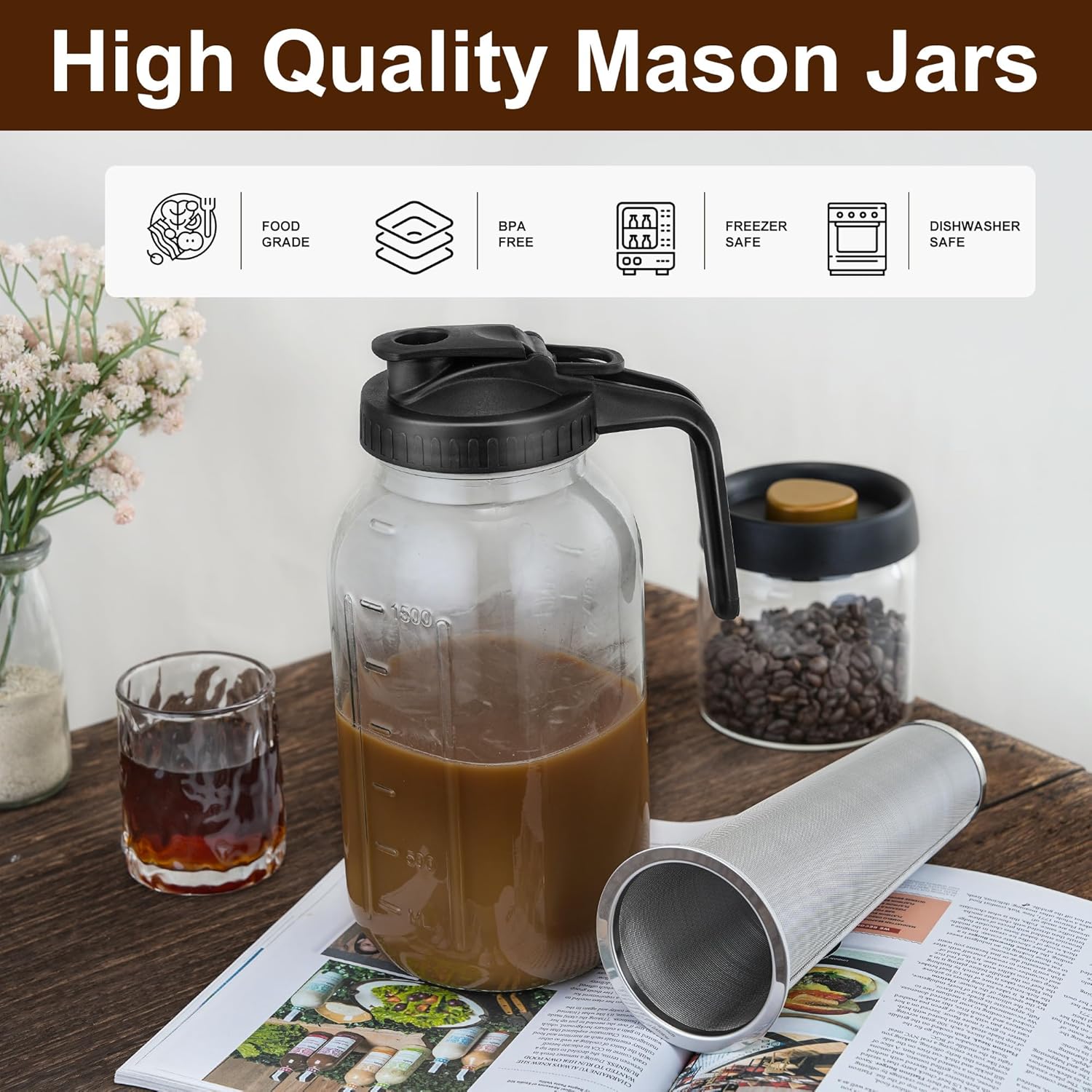 Cold Brew Coffee Maker Pitcher, 64 oz Iced Coffee Maker with Stainless Steel Filter and Pour Spout Handle Lid, Wide Mouth Thick Glass Mason Jar for Iced Coffee, Lemonade, Fruit Drinks