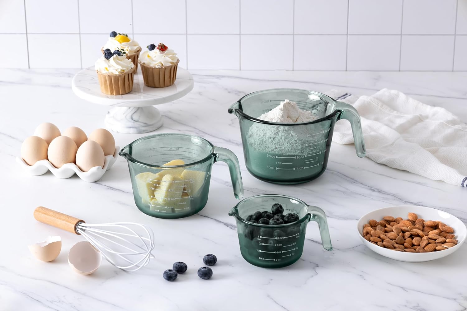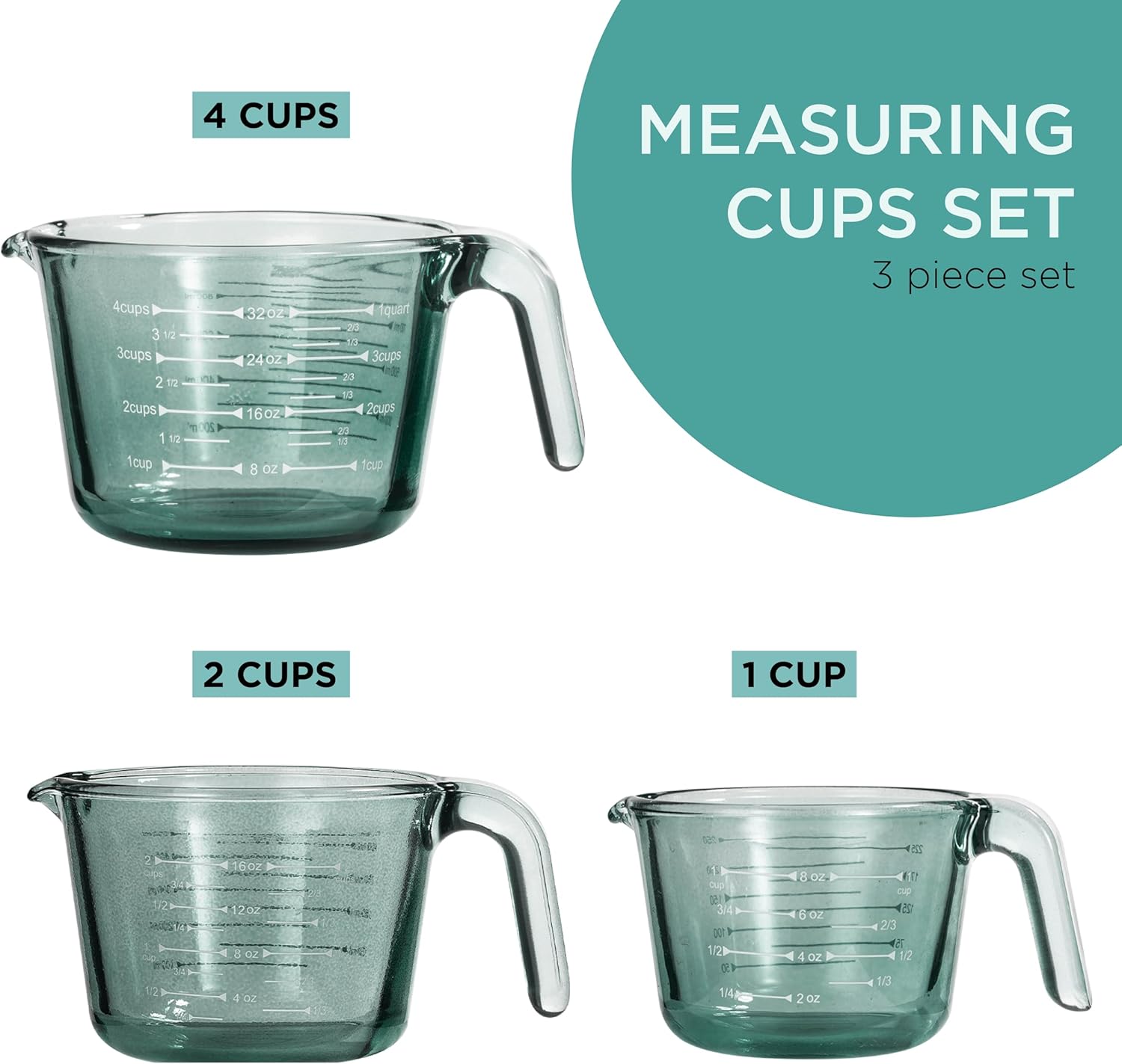 Durable Glass Measuring Cup Set: This product offers a 3 piece measuring cup set, perfect for all your cooking and baking needs. Made of high-quality colored glass, these liquid measuring cups are a must-have in every kitchen.