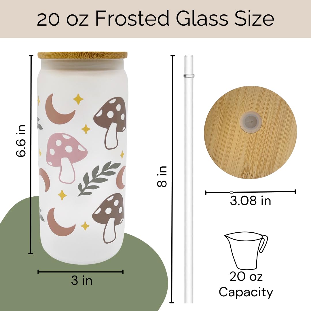 Cute 16oz Clear Glass cup with bamboo lin and plastic straw. (Frosted 20oz, Mushrooms)
