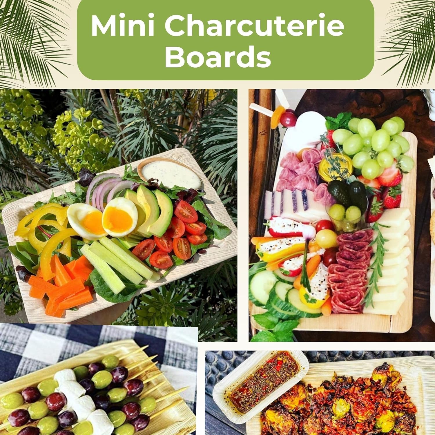 Resin Free Party Dinnerware Set: Dtocs 7″x11″ rectangle trays resembles faux wood plates and are made from resin free production process. With no polish or wax finish on the disposable plates but just pure palm leaf. These disposable platters can be considered as small kids charcuterie set.