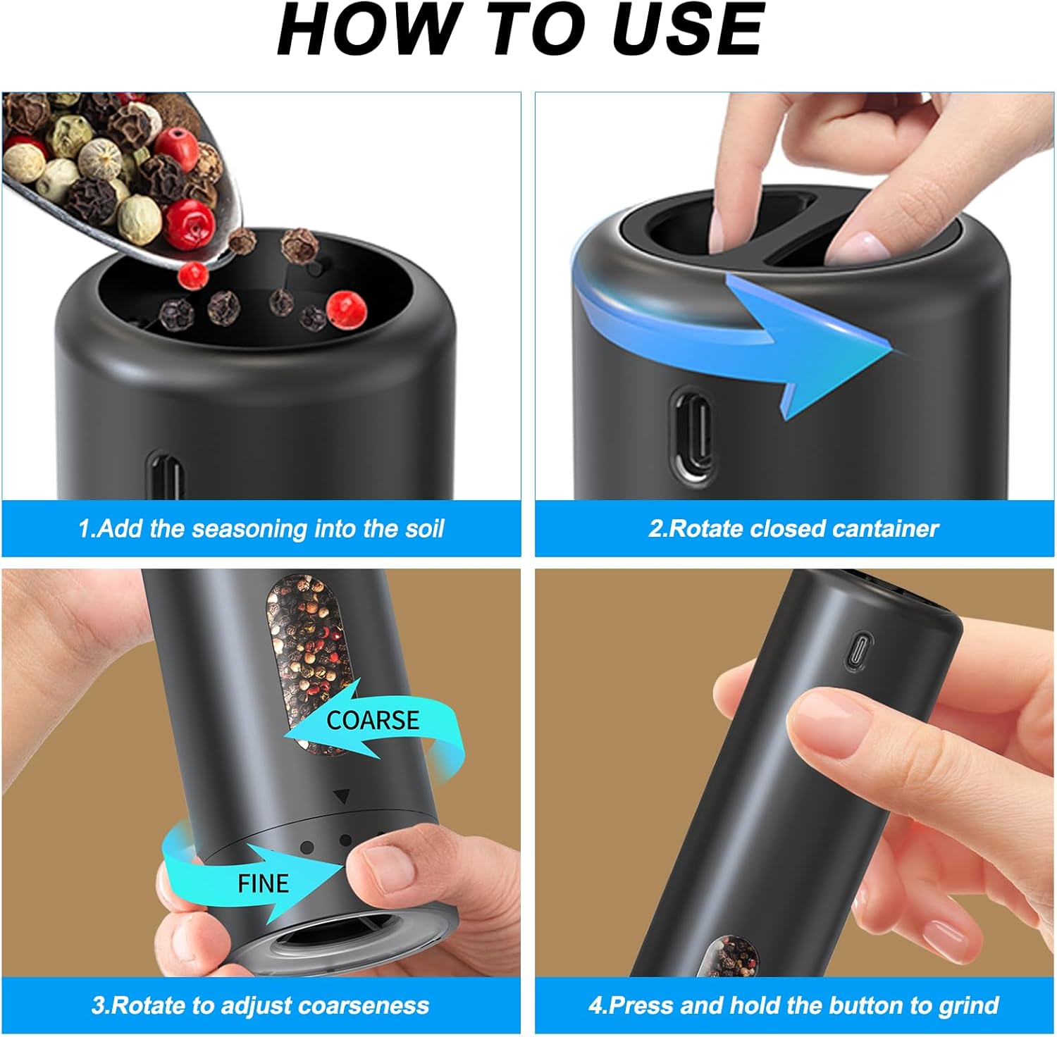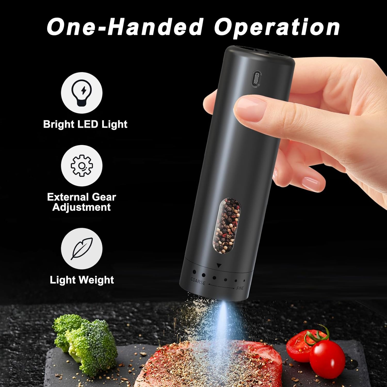 Makes Grinding So Much Easierï¼Iâve been using this salt and pepper grinder set for a few weeks now, and I absolutely love it! The one-handed operation is such a game-changerâI can season food while stirring with my other hand. The LED lights are surprisingly handy, especially for evening dinners when the lighting in my kitchen isnât great. Plus, the USB-C charging is super convenient; I havenât had to worry about batteries at all. Itâs easy to refill, looks sleek on my countertop, and works like a charm.