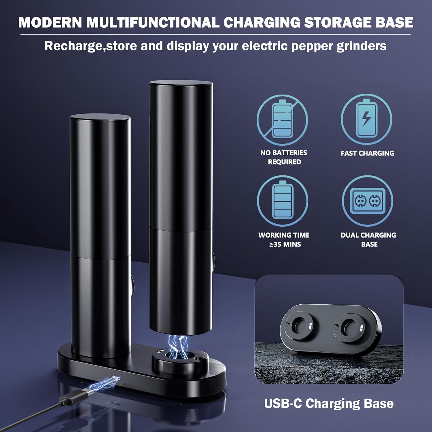 – Rechargeable Pepper Grinder set features the highest quality metal with fast Charging & Storage base and a ceramic core to ensure smooth and easy grinding with just the push of a button. A quick 5-minute charge meets your daily grinding needs, fully charged whitin 1 hour for 350 grinds. The versatile base charges two grinders at once and catches excess spice to keep your kitchen counter clean and modern.