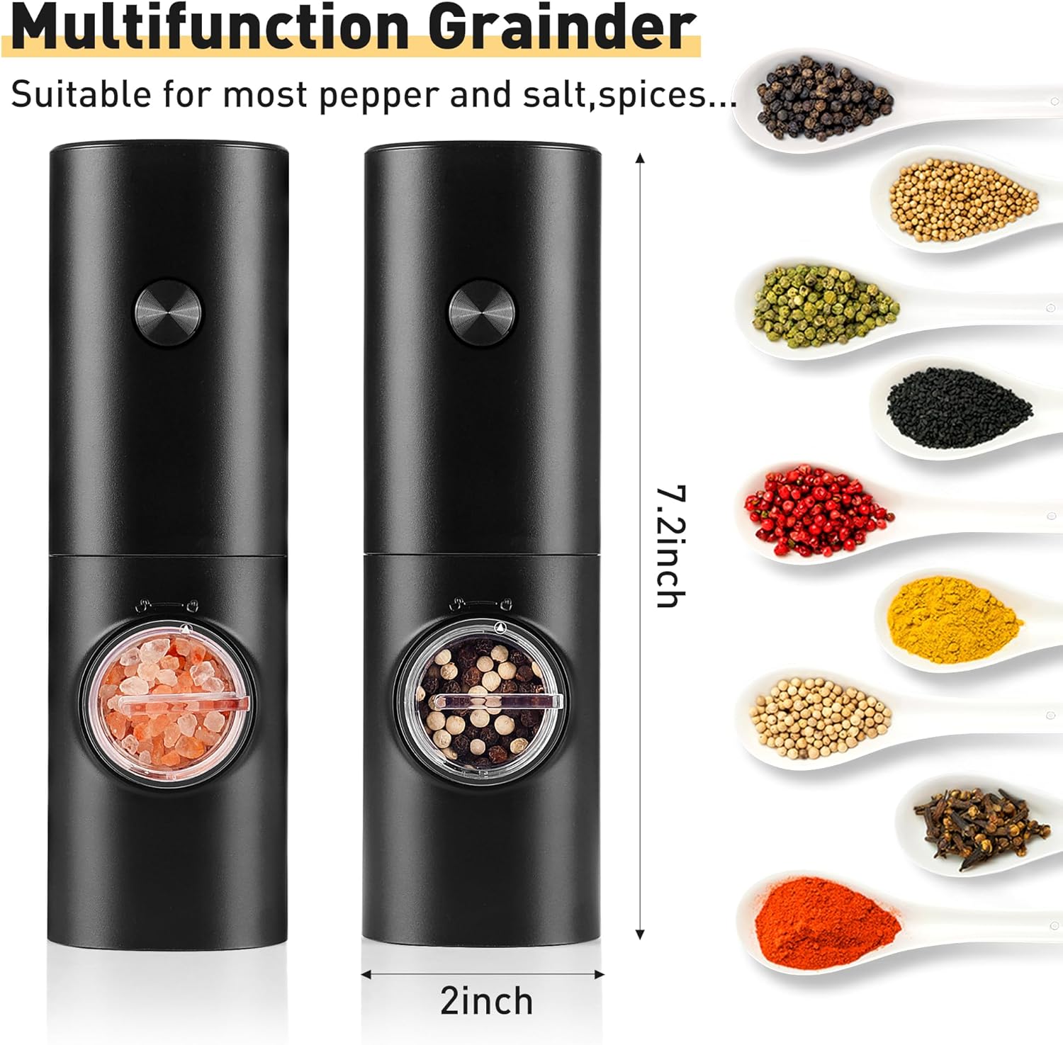 ✅ Quality materials: This electric pepper grinder is made of stainless steel and ABS materials which make them durable. It’s equipped with a ceramic rotor, with high hardness and high wear resistance. The container is designed with a clear lid, and you can easily monitor when you need to refill spices, which is convenient for filling