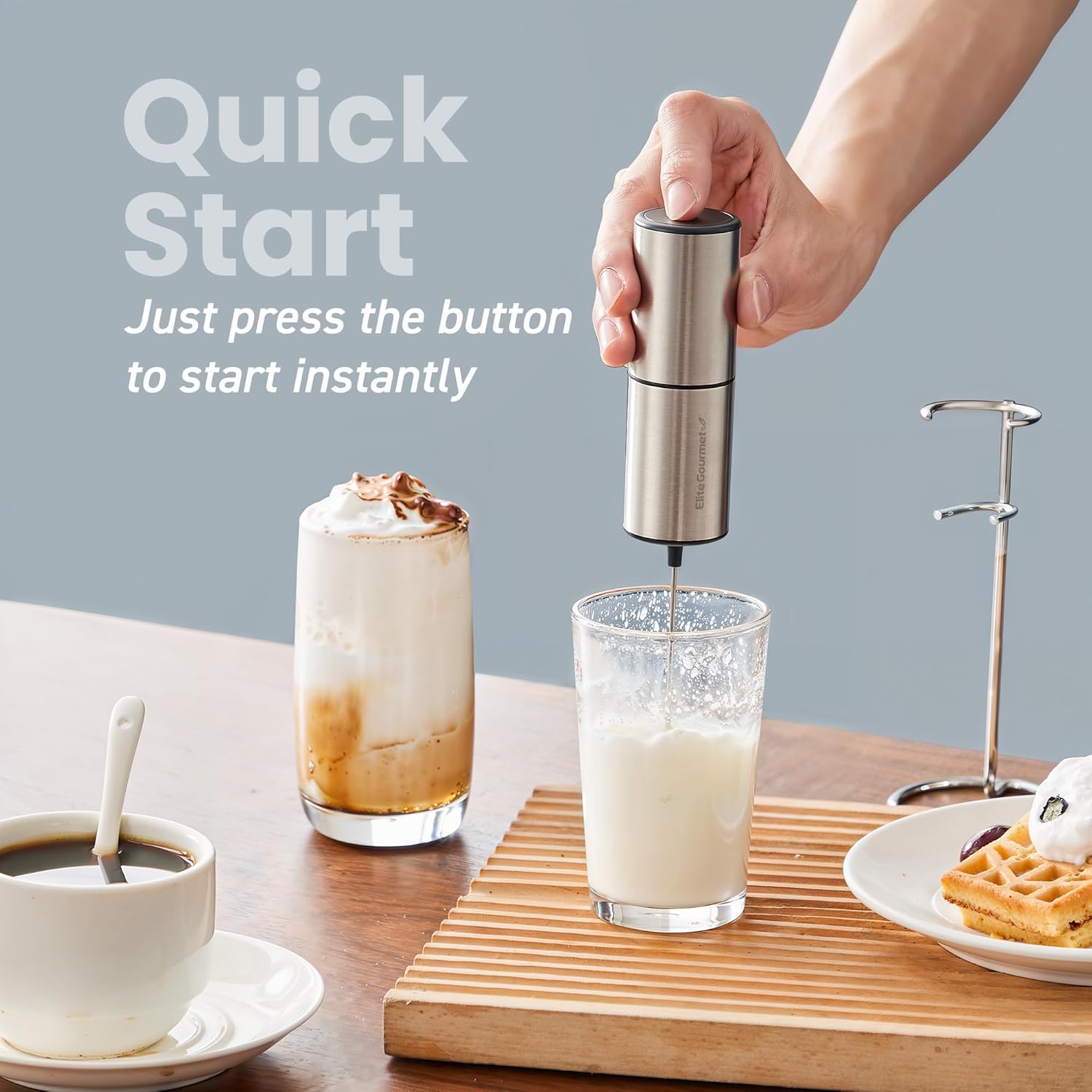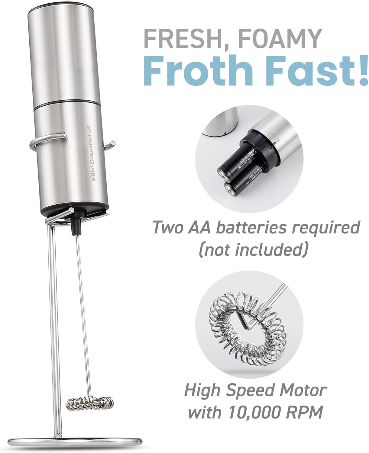 Elite Gourmet EMF9SS Cordless, Battery Operated, Milk Frother, Power Button, Food Grade Stainless Steel Whisk, Vertical Stand, Lattes, Cappuccinos, Matcha, Hot Chocolate, Iced Coffee, Stainless Steel