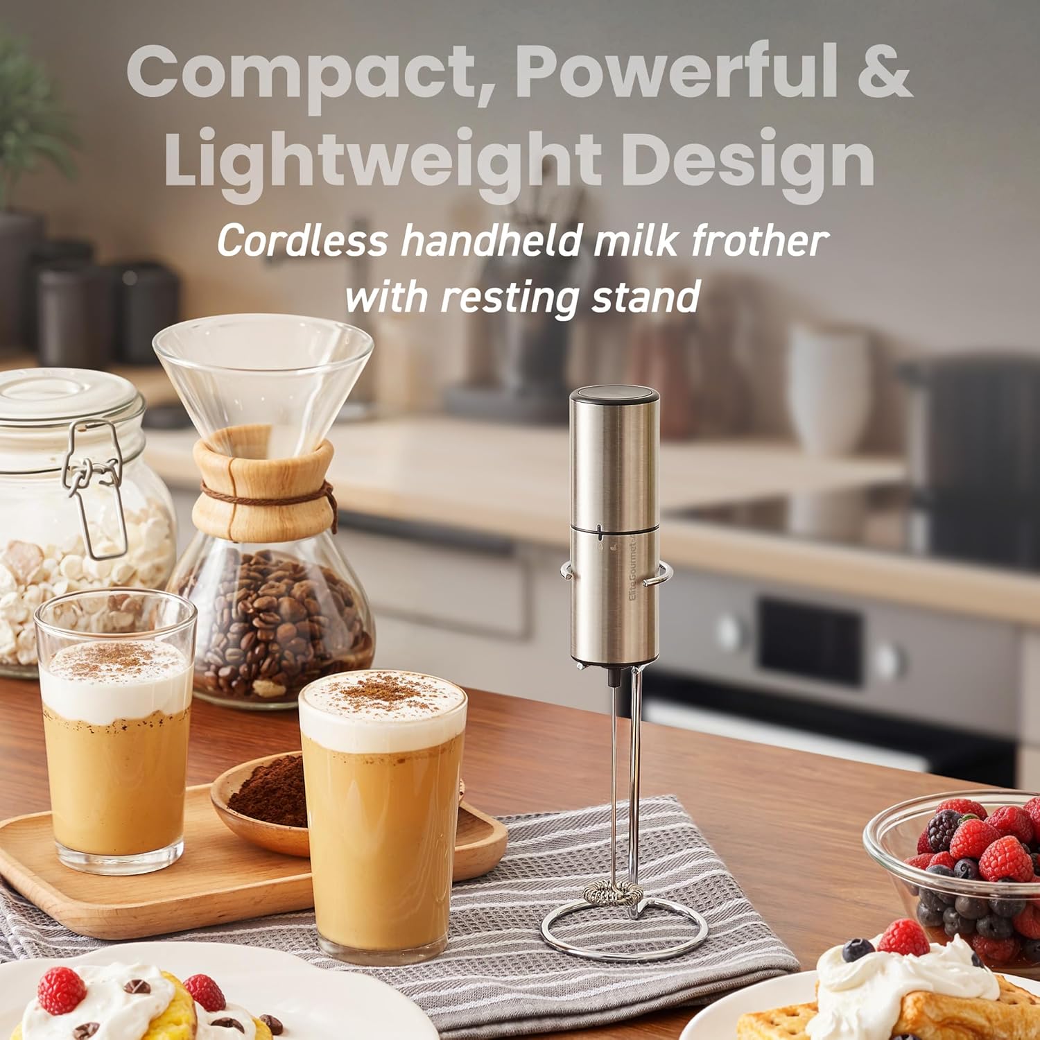 This Cordless Milk Frother is an affordable and efficient tool for frothing milk for lattes, cappuccinos, matcha, and more. Its nice sleek stainless steel design feels sturdy, and the included vertical stand makes storage simple in any location . Powered by two AA batteries, it offers cordless convenience and quickly creates smooth, creamy foam with minimal noise. The frother is easy to operate with a single power button and simple to clean by rinsing the whisk under warm water. While the battery life is good for regular use, frequent users may want spare batteries on hand. Overall, this frother offers excellent value, delivering quality performance at an accessible price point.