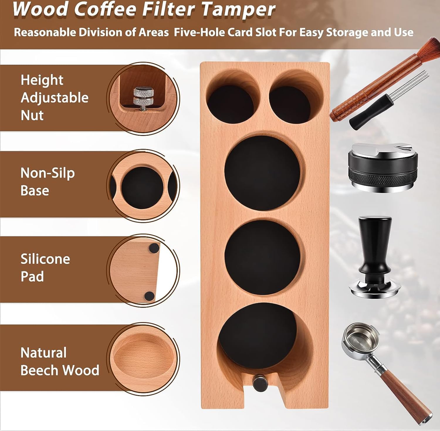 Elevate Your Espresso Game with Our Must-Have Barista Set! 🔥 Unleash your inner barista with our meticulously crafted collection, designed to enhance your espresso-making prowess. This comprehensive set includes: Wooden Espresso Tamper Station x1 Coffee Distributor and Tamper x1 Calibrated Coffee Tamper with Spring Loaded x1 Espresso Coffee Stirrer x1 Cleaning Brush x1 Wooden Espresso Tamper Station Made of Original Wooden Material, Not Splicing Or stamping Wood,Accompany your Experience with Best Barista Tool Experience Perfection in Every Cup For those who demand nothing but excellence, our set empowers you to craft the most exquisite espresso. Achieve uniform extraction for a flawlessly balanced flavor profile, making you a true professional barista. Dual Head Espresso Distributor: Your Espresso Precision Tool Crafted from Food-Grade 304 stainless steel, our 54mm espresso distributor/leveler boasts a unique 2-in-1 dual head design. A few simple rotations ensure a pristine, level filter basket floor – eliminating variables in espresso-making. With adjustable depth, consistent distribution and pressure are effortlessly achieved, allowing you to pull your perfect shot at home. 🌟 Spring-Loaded Calibrated Tamper: Elegance in Every Press Elegance meets functionality in our exquisite, high-quality aluminum alloy tamper. Ergonomically designed handles offer a flawless grip. Tested and proven, a 30 Ib tamping strength yields exceptional espresso quality. Taste the difference as you bid farewell to local cafes and embrace the art of hand-brewed coffee. Neat & Consistent Workspace: Your Barista Haven Banish clutter from your coffee haven! Our wooden espresso tamper mat keeps your space organized. The storage box corrals your espresso tamper essentials, while four non-slip feet ensure stability. Your quest for professional barista finesse begins here. Espresso Stirrer & Wooden Cleaning Brush