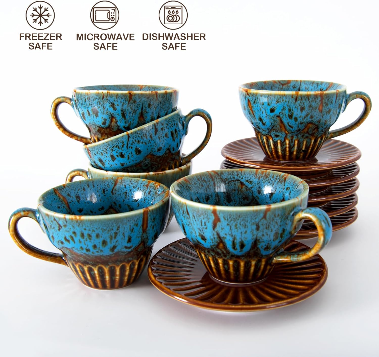 Espresso Cups with Saucers, 4 oz Ceramic Coffee Cups, Demitasse Cups for Single or Double Espresso, Macchiato, Tea, Small Latte and Cappuccino, Set of 6, Glazed Blue
