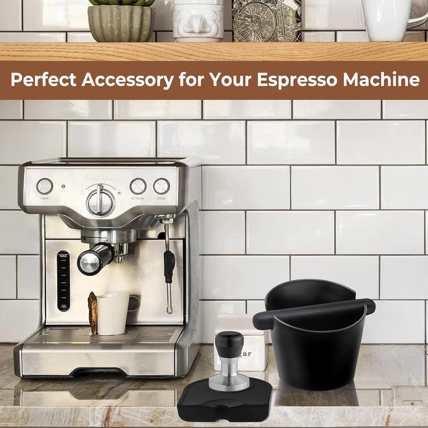 ☕【Espresso Machine Accessories】: This kit is the perfect espresso machine accessories. The knock box espresso is suitable for collecting coffee grounds next to the espresso machine. And the espresso tamping mat is a good helper for holding coffee, the corner design allows you to tamp on the edge of tables and counters at a 90-degree angle, improving stability and evenness when tamping, and protects the counter and handles from damage.