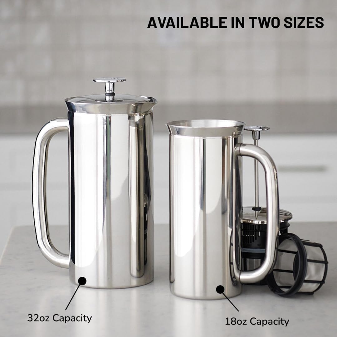 Hotter for Longer – Our insulated double-walled insulated french press with a stainless steel design, handles, and knobs not only look sleek, but keep coffee hotter for longer and provide more durability than traditional glass presses.