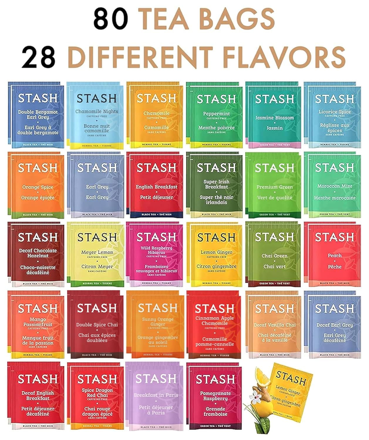 PERFECT COMBINATION FOR STASH TEA LOVERS: Our Stash Tea Bags Sampler Assortment Variety Pack count (80) individual. 28 Flavors