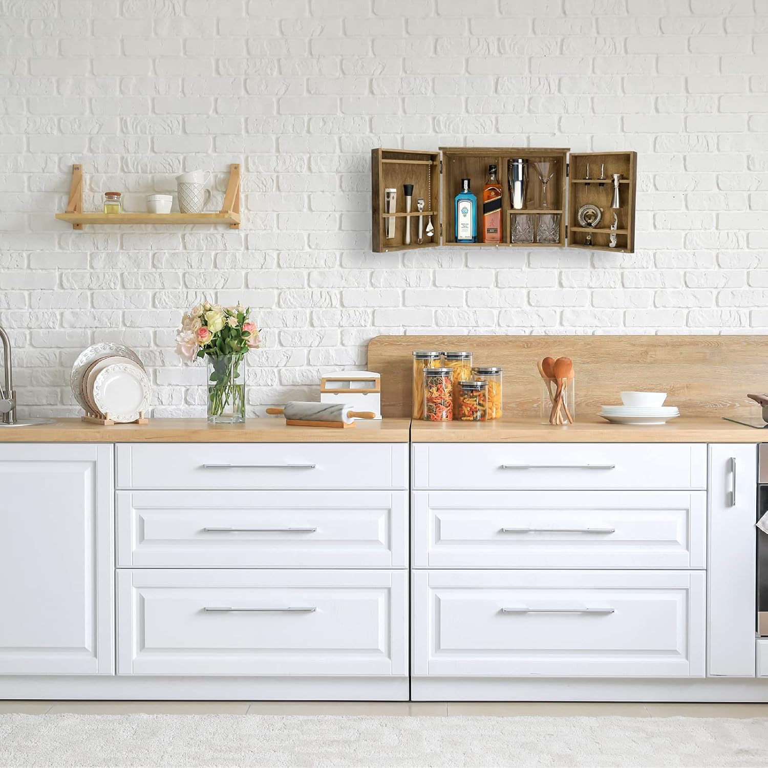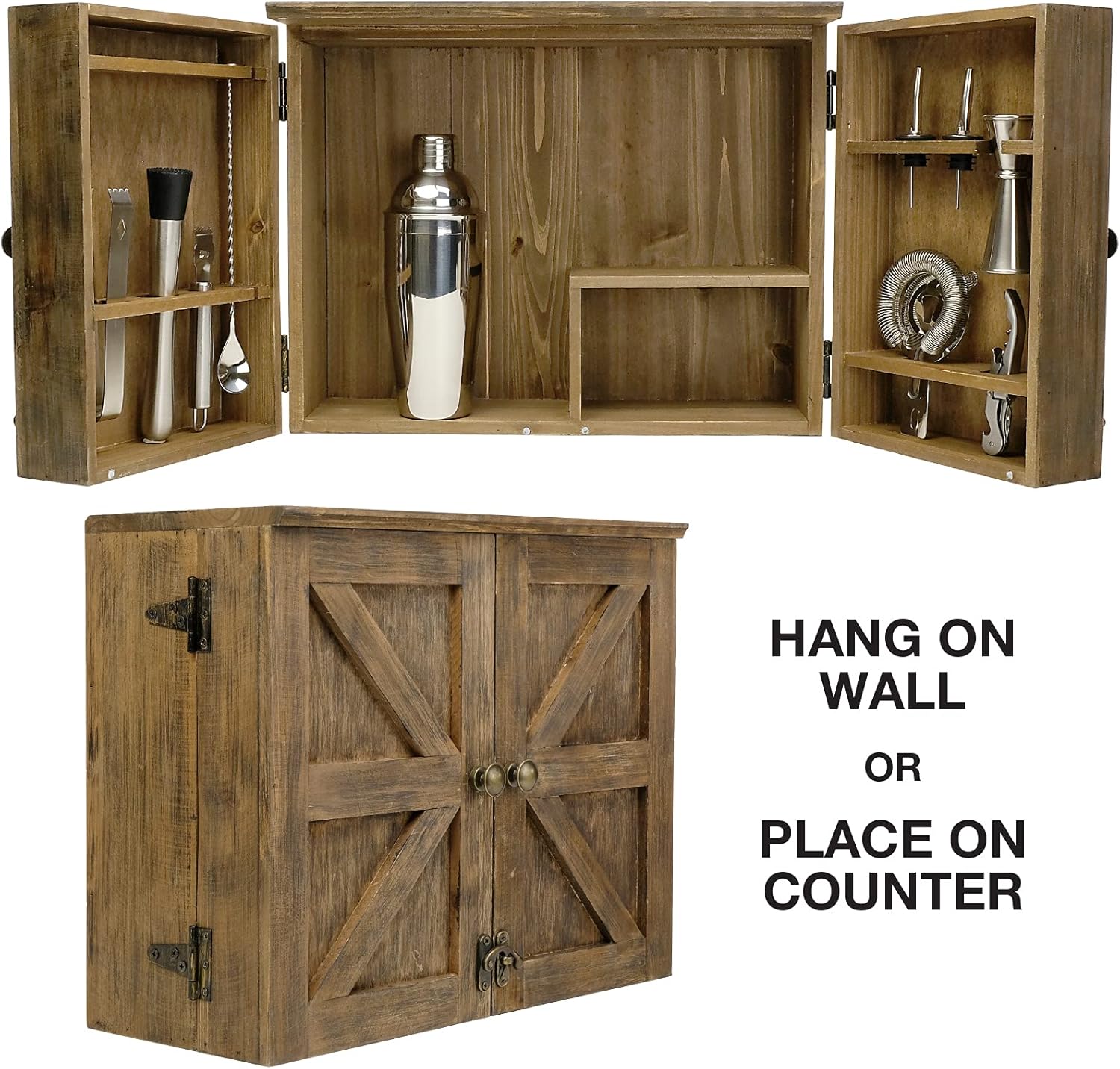 RUSTIC DESIGN – Our Barndoor Bar Cabinet will look great in any bar, parlor, kitchen, or mancave. Place on the counter or hang it on your wall!