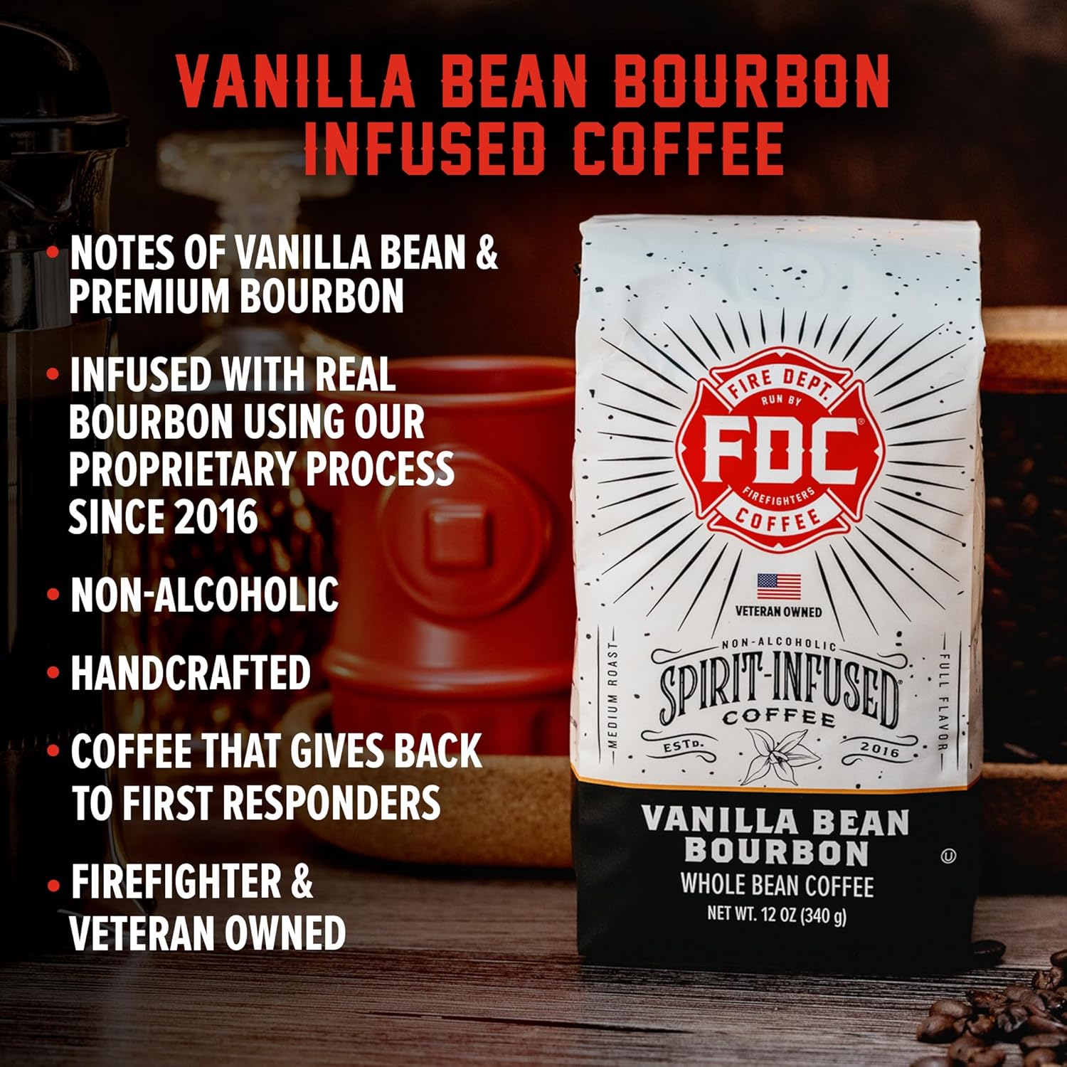 Fire Department Coffee – Vanilla Bourbon Coffee – Gives Back to Firefighters – Vanilla Bean Bourbon Infused Coffee Beans – Whole Bean Coffee – Non-Alcoholic – Roasted in the USA – Veteran Owned – 12 oz