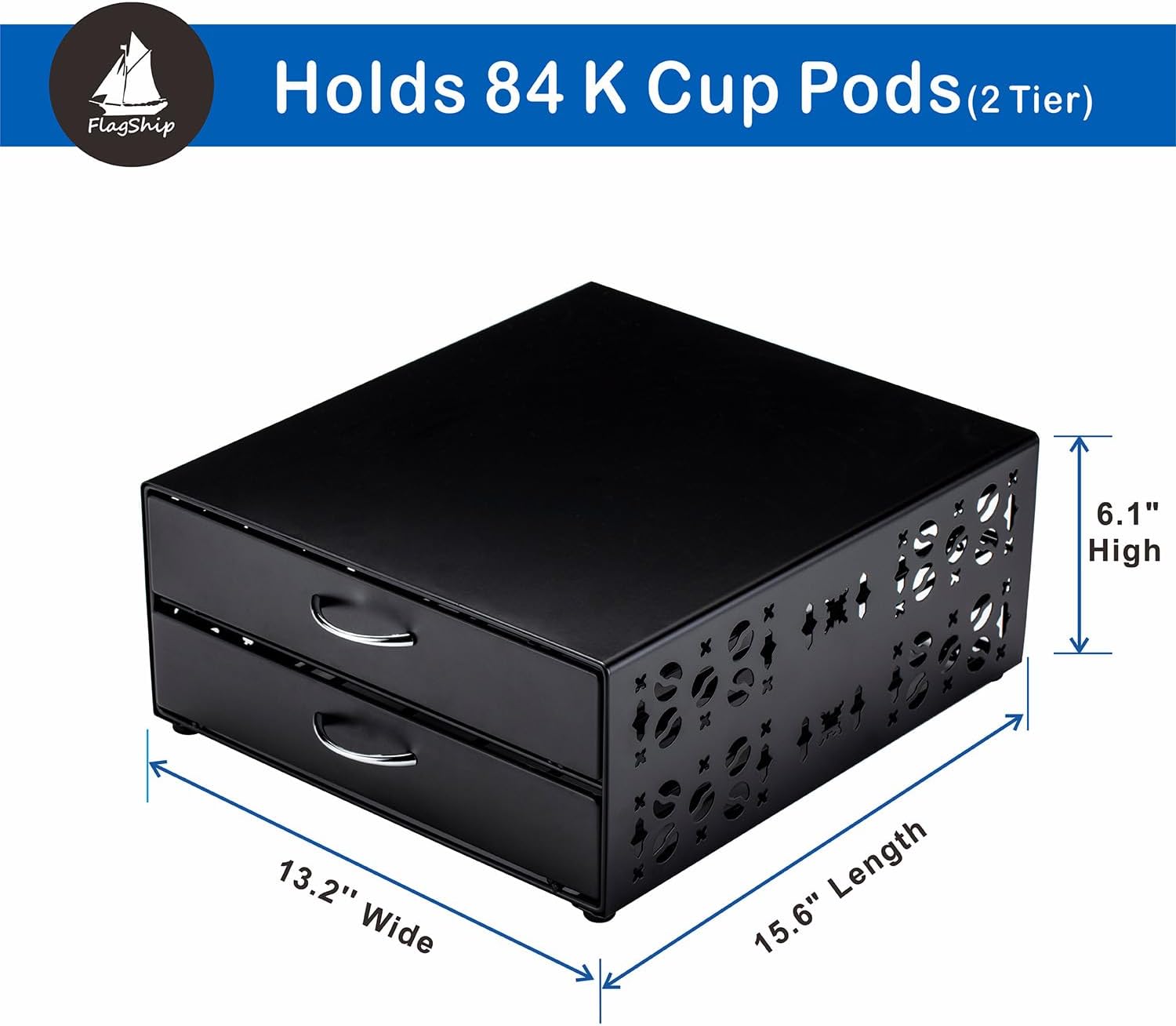 The FlagShip K-Cup Organizer Drawer has been a true game-changer for our coffee bar setup. Struggling to find an ideal storage solution for our K-Cups, this drawer was the perfect fit beneath our coffee bar shelf. It organizes a plethora of K-Cups, ensuring our coffee station remains clean and well-organized.Key Highlights: Designed for Coffee Stations: Its modern design not only keeps capsules tidy but also offers a neat counter space. The tiered system lets us find our favorite coffee flavors quickly, and the spacious top serves as a mini platform for all coffee-related accessories if you wanted to place on a counter. Space-Saving: Measuring 13.2âW x 15.6âL x 6.1âH, it efficiently utilizes small spaces to accommodate a large number of K-Cup pods, effectively decluttering our coffee station. Large Capacity: With the ability to hold up to 84 pods, this drawer ensures weâre never short on coffee. Itâs organized into two tiers, with each tier capable of holding 42 pods, making coffee pod management a breeze. Durable and Stylish: The metal frame is not only sturdier than plastic but also elegantly designed to fit seamlessly into a modern kitchen or coffee station. User-Friendly Design: The drawers slide out effortlessly, making pod organization and access hassle-free. Its unique hollow groove design perfectly fits K-cups, significantly reducing our coffee preparation time.Weâre beyond thrilled with this addition to our coffee bar. The FlagShip K-Cup Organizer Drawer has solved our storage dilemmas, making our coffee mornings more enjoyable and streamlined.