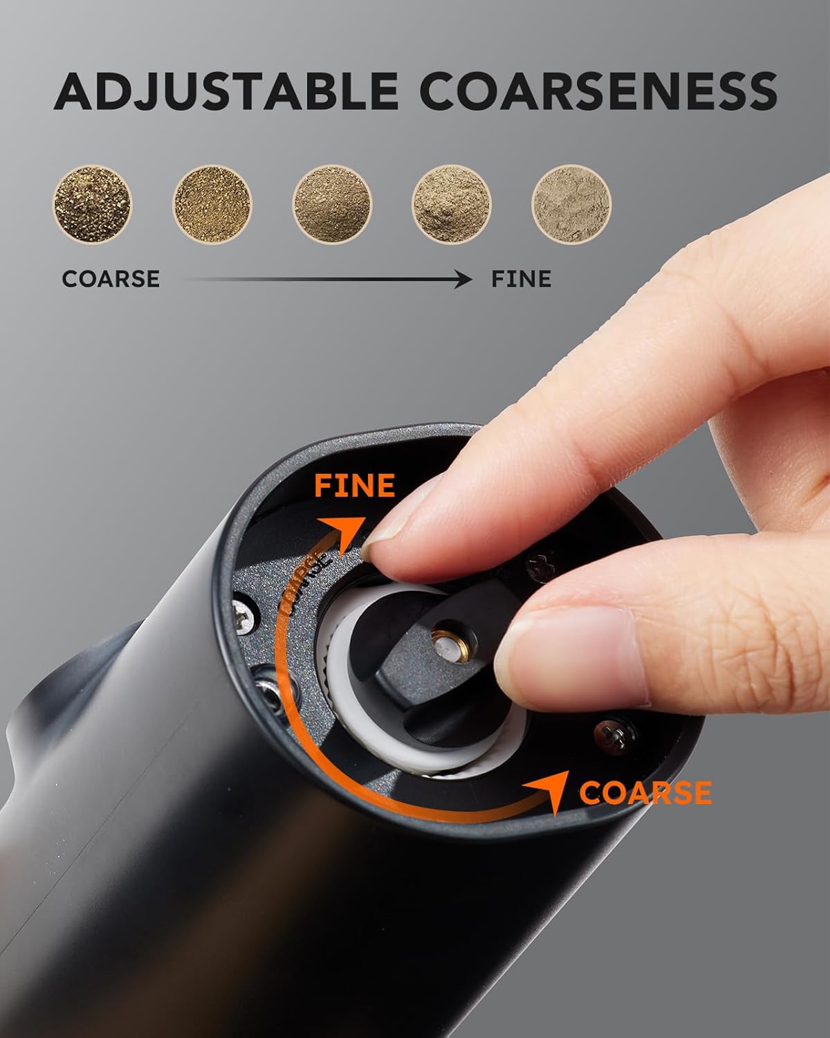 ADJUSTABLE COARSENESS: Create the perfect grind for any dish with the FORLIM electric salt and pepper grinder set. Featuring a multi-position adjustable knob, you can easily turn left for coarseness and right for fineness, allowing you to adjust the coarseness of the grind to your liking. Enjoy freshly ground pepper or salt anytime, anywhere with this sleek and convenient grinder