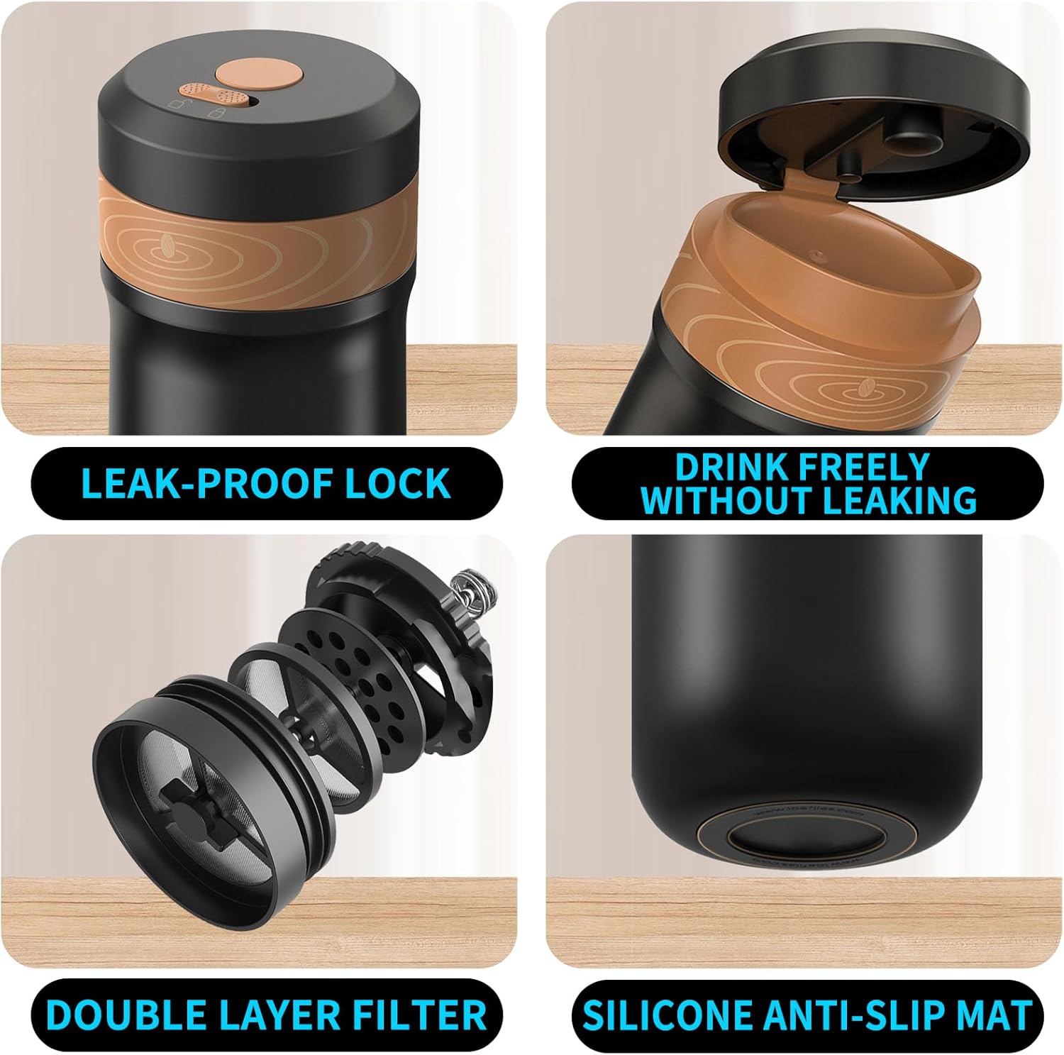 DOUBLE FILTER SYSTEM: Portable french press travel mug have inner special design water isolation system that can separating grounds from coffee, keeping coffee falor for a long time and helping to make your cup without sediment. Unique spring-loaded valve seals snugly and doesn’t allow any of the coffee grounds to come back up into the mug