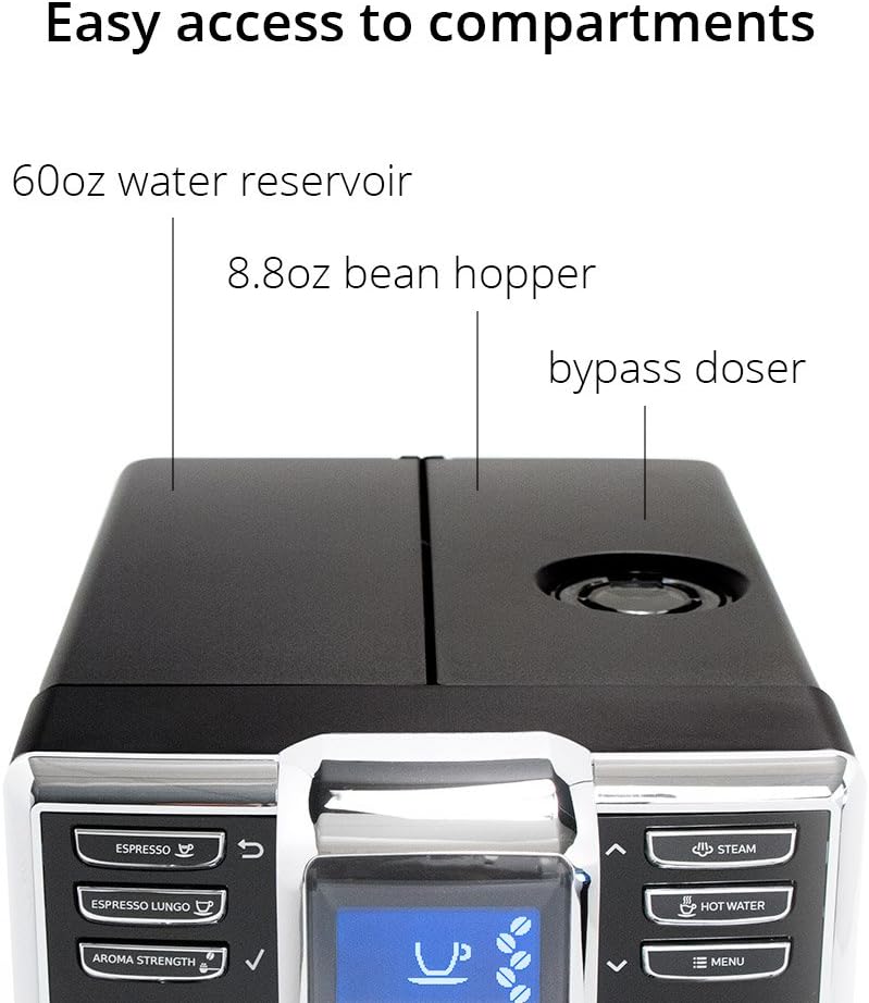 EASY ACCESS TO WATER RESERVOIR AND BEAN HOPPER: Features a removable 60 oz water reservoir that can be accessed on the top left of the machine, and an 8.8 ounce capacity bean hopper with access from the top right of the machine