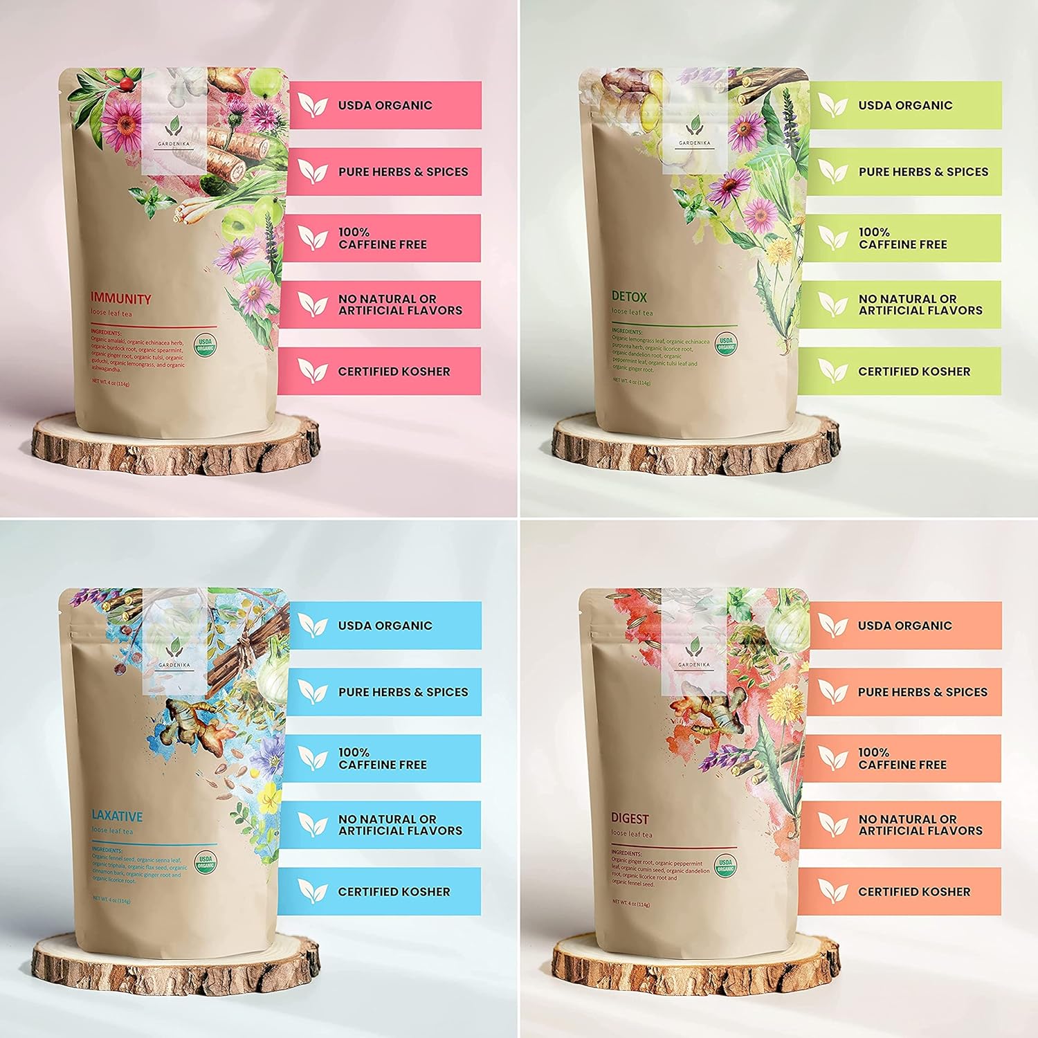 Gardenika Organic Loose Leaf Tea Sampler – 8 Pack, 1 LB – Herbal and Naturally Caffeine-Free Set – Ayurvedic Assortment Blend