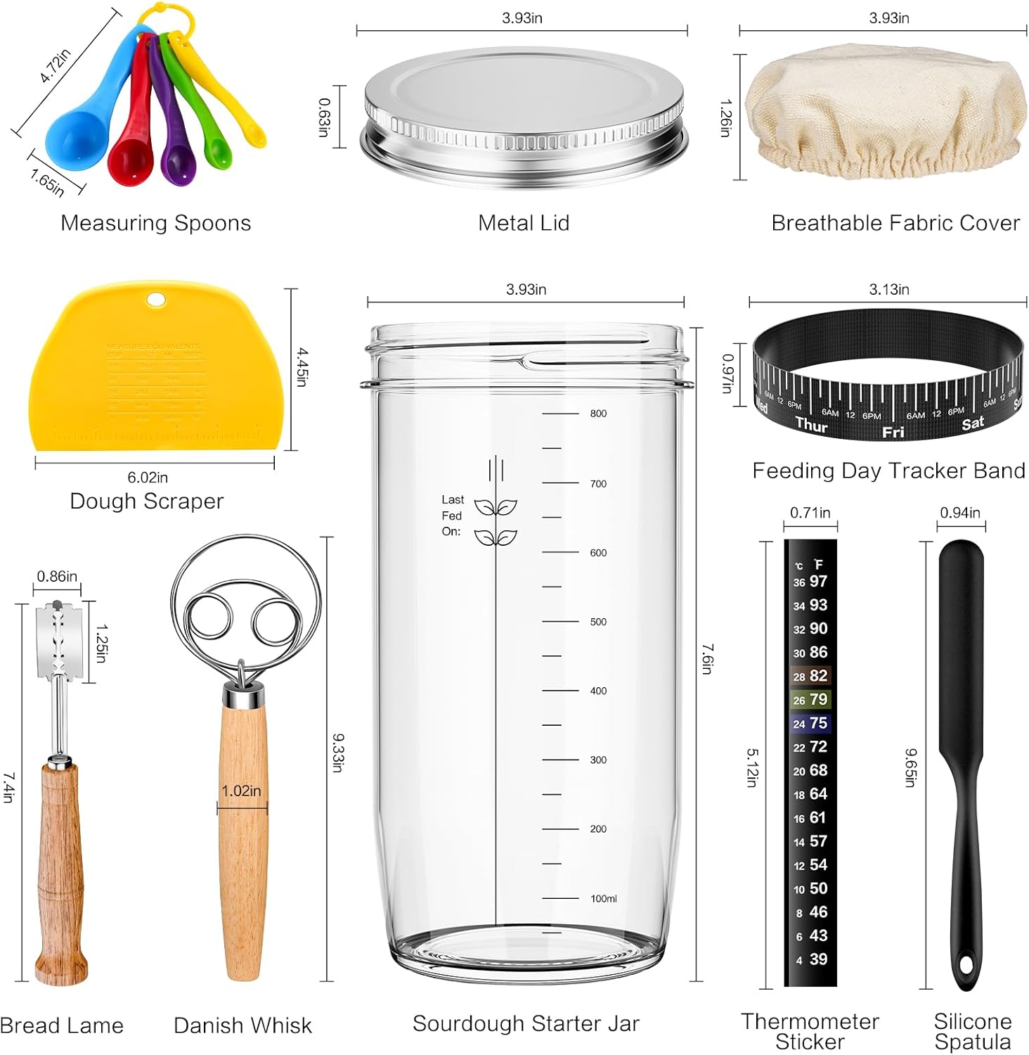Practical Sourdough Starter Jar Kit: You will get a 36oz glass jar for sourdough starter, a date marked feeding band, a temperature sticker, a breathable cloth cover, an airtight aluminum lid, sourdough spatula, danish whisk, dough scraper, bread lame with 5 replacement blades, and 5 measuring spoons of different sizes. SOURDOUGH STARTER IS NOT INCLUDED!