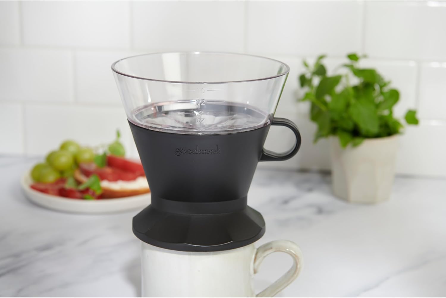 As coffee is part of many people’s daily wake up routine, having good coffee is a must for the start of any great day! Usually making your own coffee is a lot cheaper than going to a coffee shop, and this GoodCook Pourover coffee maker is a great way to do that! It is easy to use and takes up not a whole lot of space in the kitchen. Simply place this coffee maker on top of any mug and together with a coffee filter on top, pour hot water on top of the coffee grounds. The coffee drink will slowly drip down into the mug, making for a great tasting cup.One downside I would say is that this pourover coffee maker is made of plastic and since coffee requires hot water to make, high temperatures and plastic is usually not a good combination. I wish this was made with glass instead, but given the price I would say this is a decent budget option.