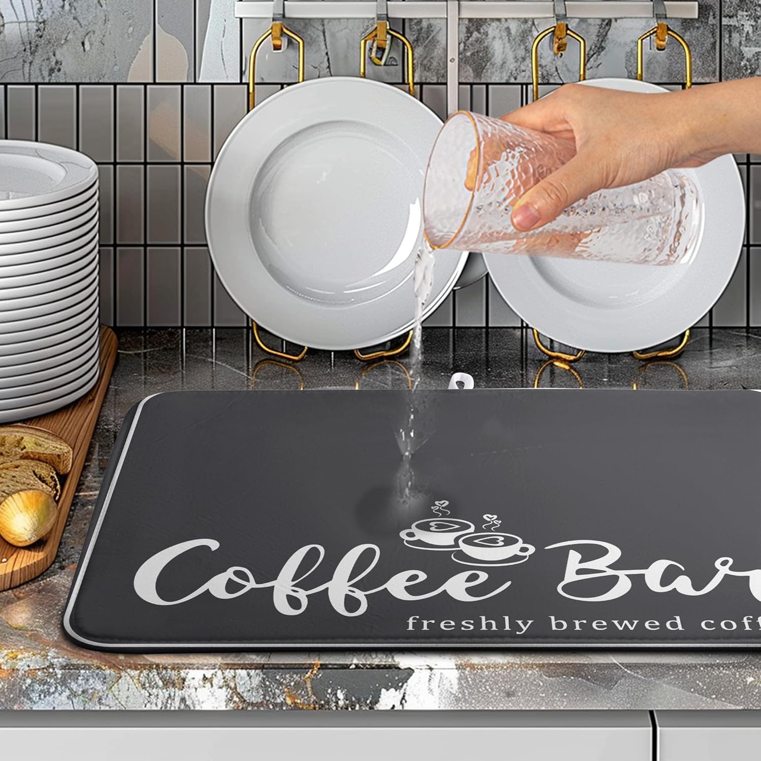 [Multi-functional]: This grey coffee bar dish drying mat can be placed under the dish rack to collect dripping water to keep the counter dry and clean, or you can place bottles, pots, plates, bowls, cups and other utensils directly on the mat. grey coffee bar dish drying mat grey coffee bar dish drying mat can also be placed under the coffee machine to absorb spilled coffee.