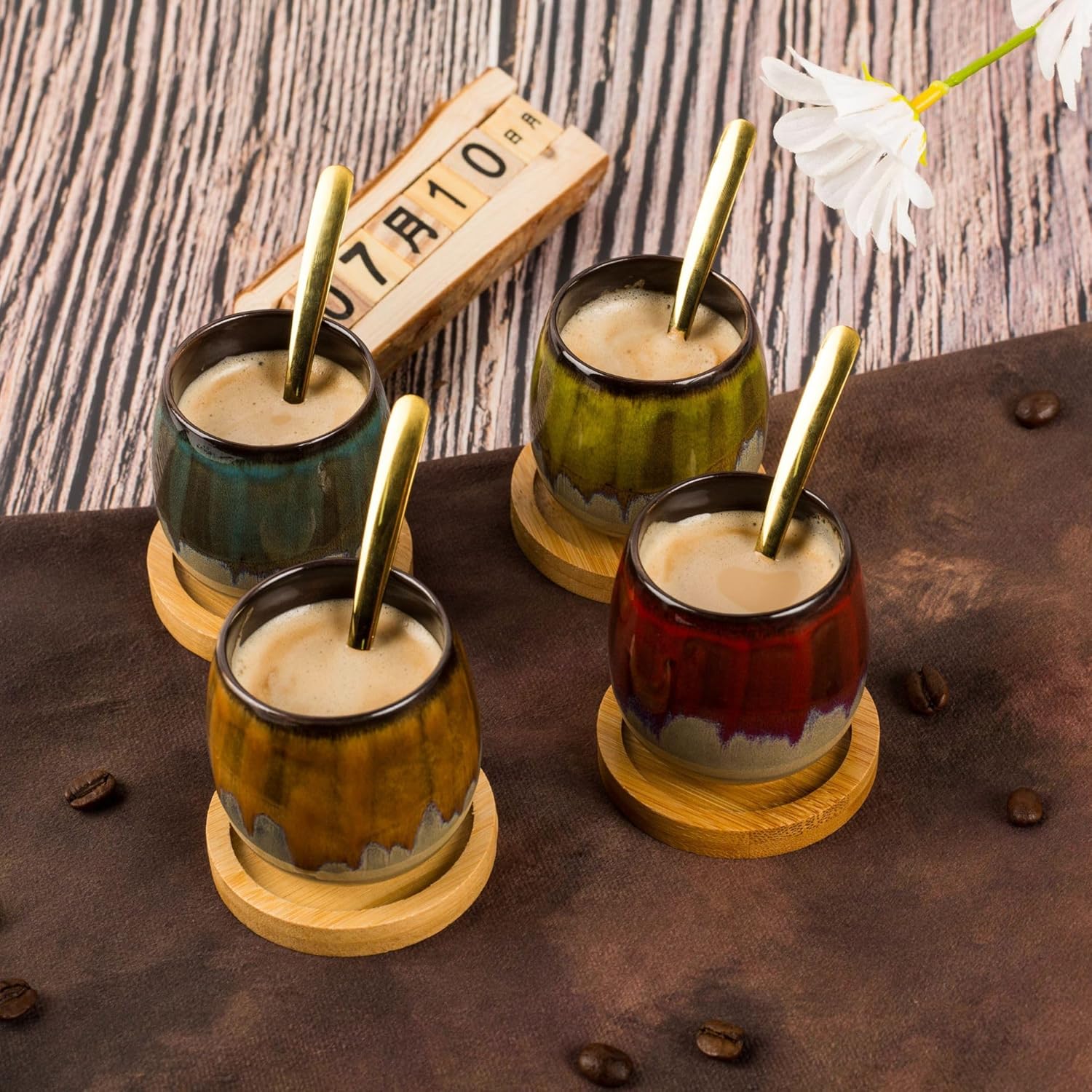 Hand-painted Ceramic Espresso Cup with Bamboo Tray holder and Spoons Set of 4, 2.7 Oz 80ml Kung Fu Tea Set,Demitasse cup,Tazas de Cafe, Yerba Mate Cup,Korean soju(4 Colors Mix)