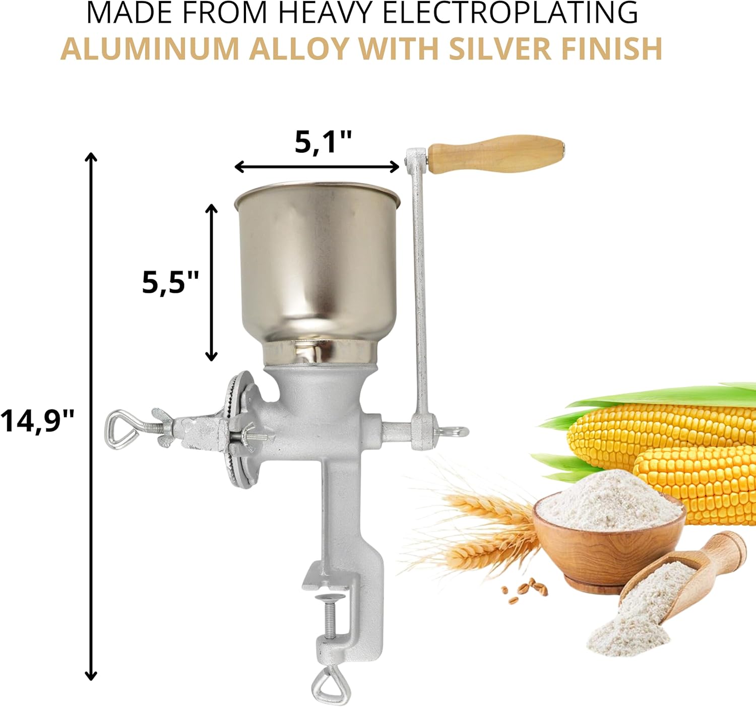 Material: The grain mill hand crank, corn cracker mill is made from heavy electroplating aluminum alloy with silver finish. Crafted with durability in mind, our hand crank mill grinder is made to last. With its ergonomic design, the flour mill hand crank offers comfortable and effortless operation