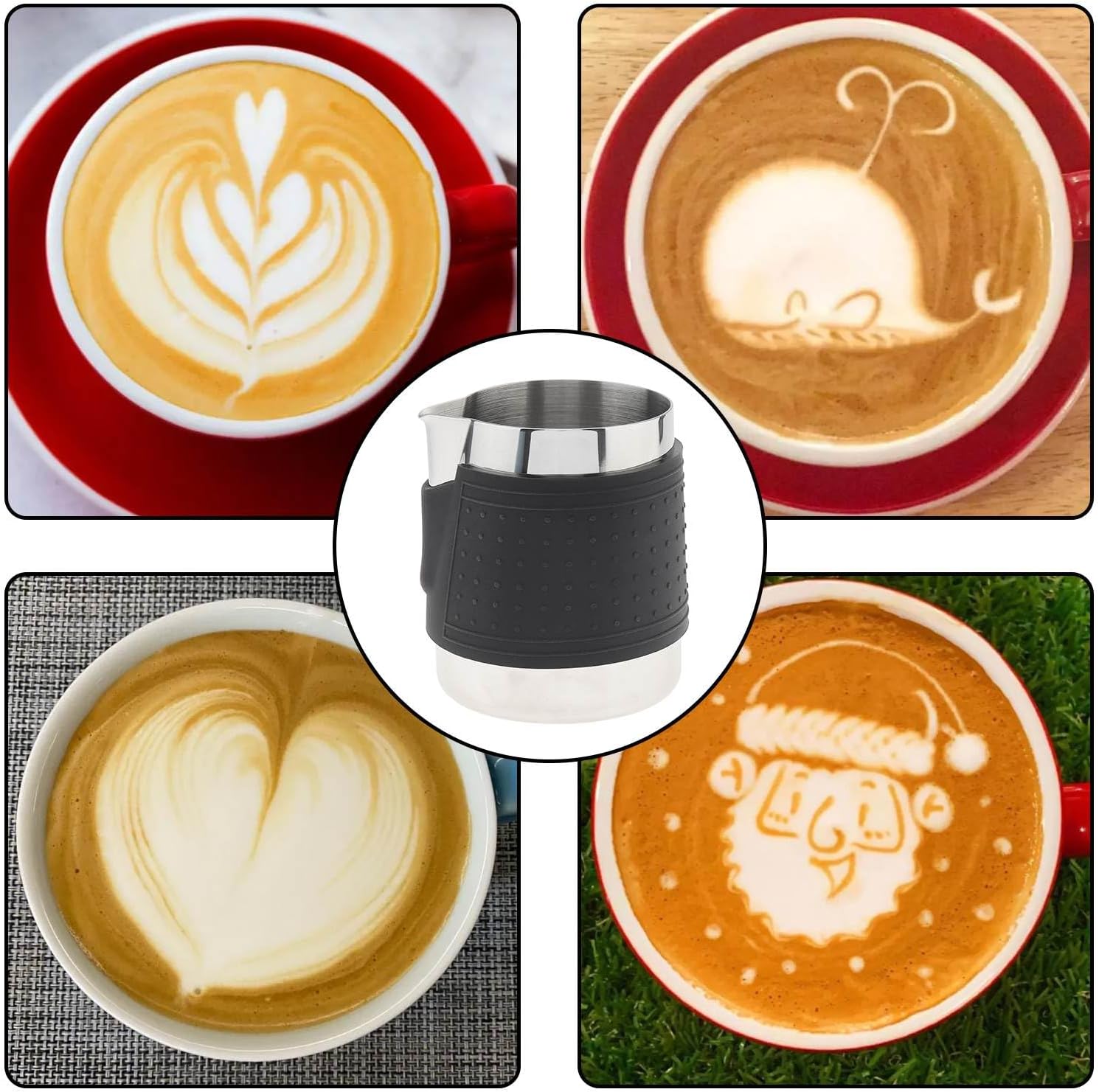 1. Make Perfect Latte Art – Create precise latte art with ease! The accurate spout is wide enough to balance a steam wand, perfect for mastering latte art. Cater to your love for coffee by creating elegant ripples and fine details. This stainless steel steamer cup feels secure and balanced in your hand thanks to the silicone heat-resistant grip. No need to worry about it slipping or making messes while crafting the perfect latte.