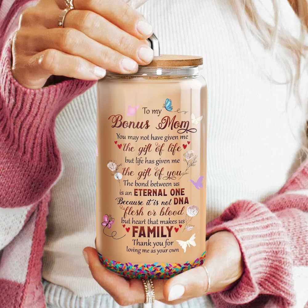 Heart Bamboo Lid Straw Butterfly Decorations Glass Cup Women Coffee Mug Hot, Day Mothers Juice, Mom Gifts, To Bonus Mom, Glass Cup Tumbler 16 Oz With Lid And Straw