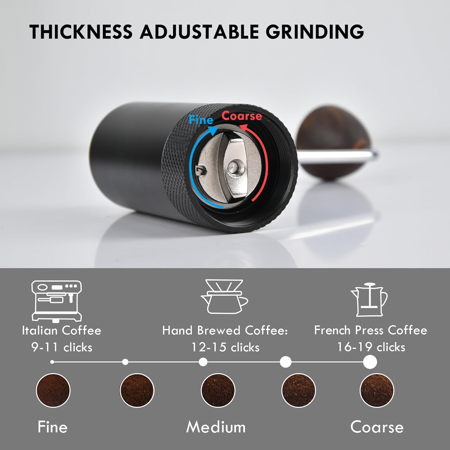 12-POINT ADJUSTMENT: Built-in grinding adjustment knob, rotate the grinding knob to obtain the desired coffee taste (clockwise for fine grinding, counterclockwise for coarse grinding, turn clockwise to the end before use to set the initial scale). For any type of coffee preparation, we offer you the ideal coffee grind fineness.