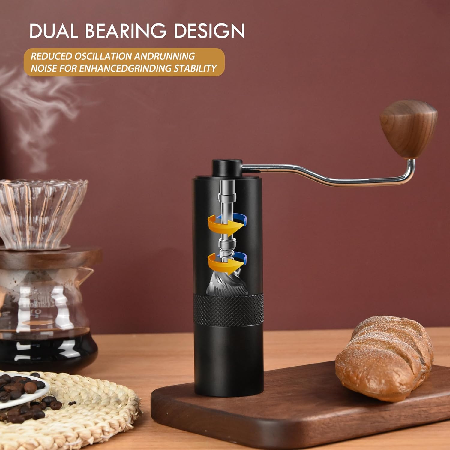 DOUBLE BEARING STABILITY: The coffee grinder is fixed with a double bearing design, which is different from bearingless and single bearing. The double bearing has higher concentricity and the grinding core is not easy to deflect, making it more stable. Equipped with walnut comfortable rocking handle, grinding is smooth and effortless.