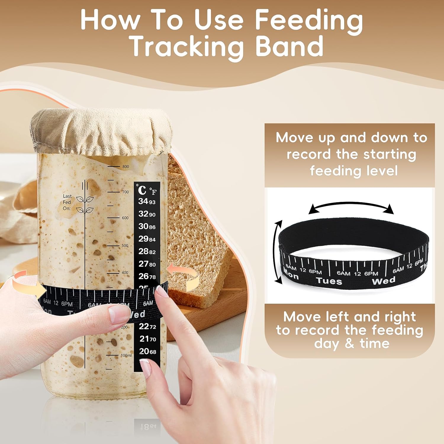 Never Forget The Last Time You Fed Your Starter: Elastic band marked with the days of the week & the time of day gives you an accurate indication of when you last fed your sour dough starter and the starting feeding level. Simply move the band sideways to indicate the time of feeding and up and down to mark you starting feeding level.