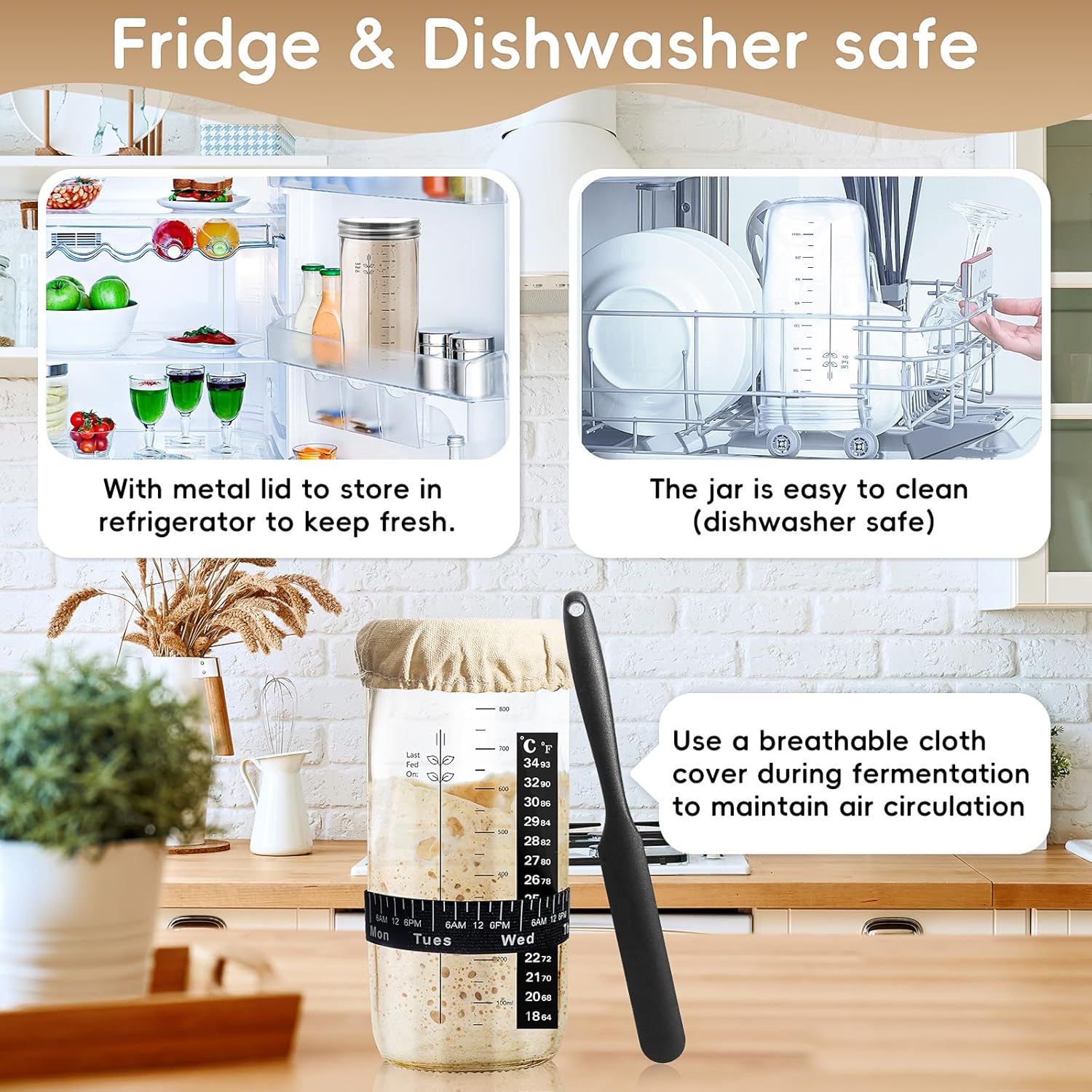 Large capacity & easy to use. The sourdough jar has a 35 oz capacity and makes 4-5 sourdough loaves. You can easily add flour and water to this wide-mouth glass jar and remove the starter when needed. A spatula aids in the efficient stirring, and a temperature sticker helps you monitor the starter temperature in real-time. The Date/time feeding tape helps you keep track of time. Easy to observe and clean (dishwasher safe).