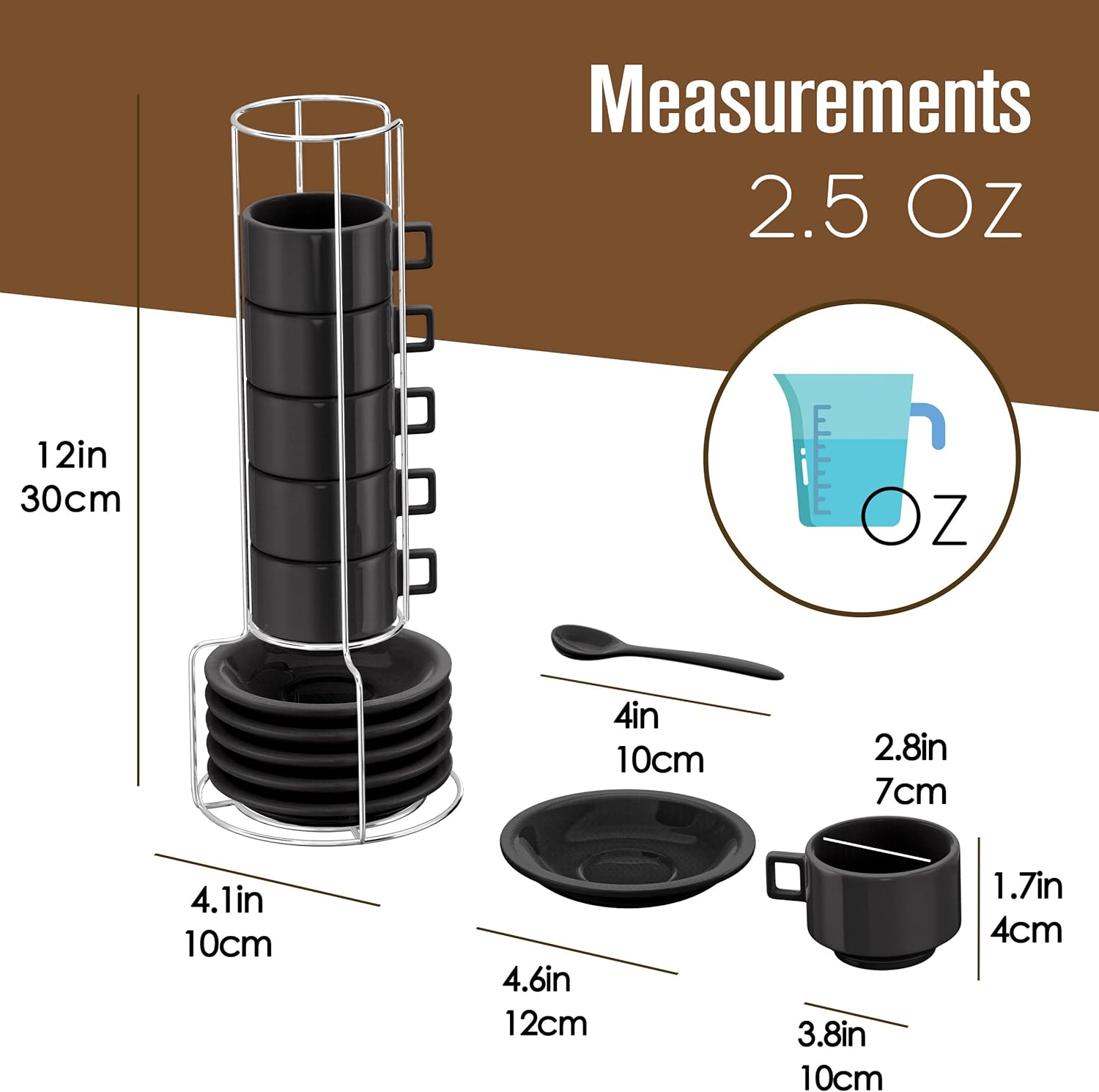 SAVE COUNTER SPACE: These lead free espresso stackable cups come with a stand holder rack to store all included pieces. You do not have to sacrifice very much prime kitchen real estate for the sake of this set.