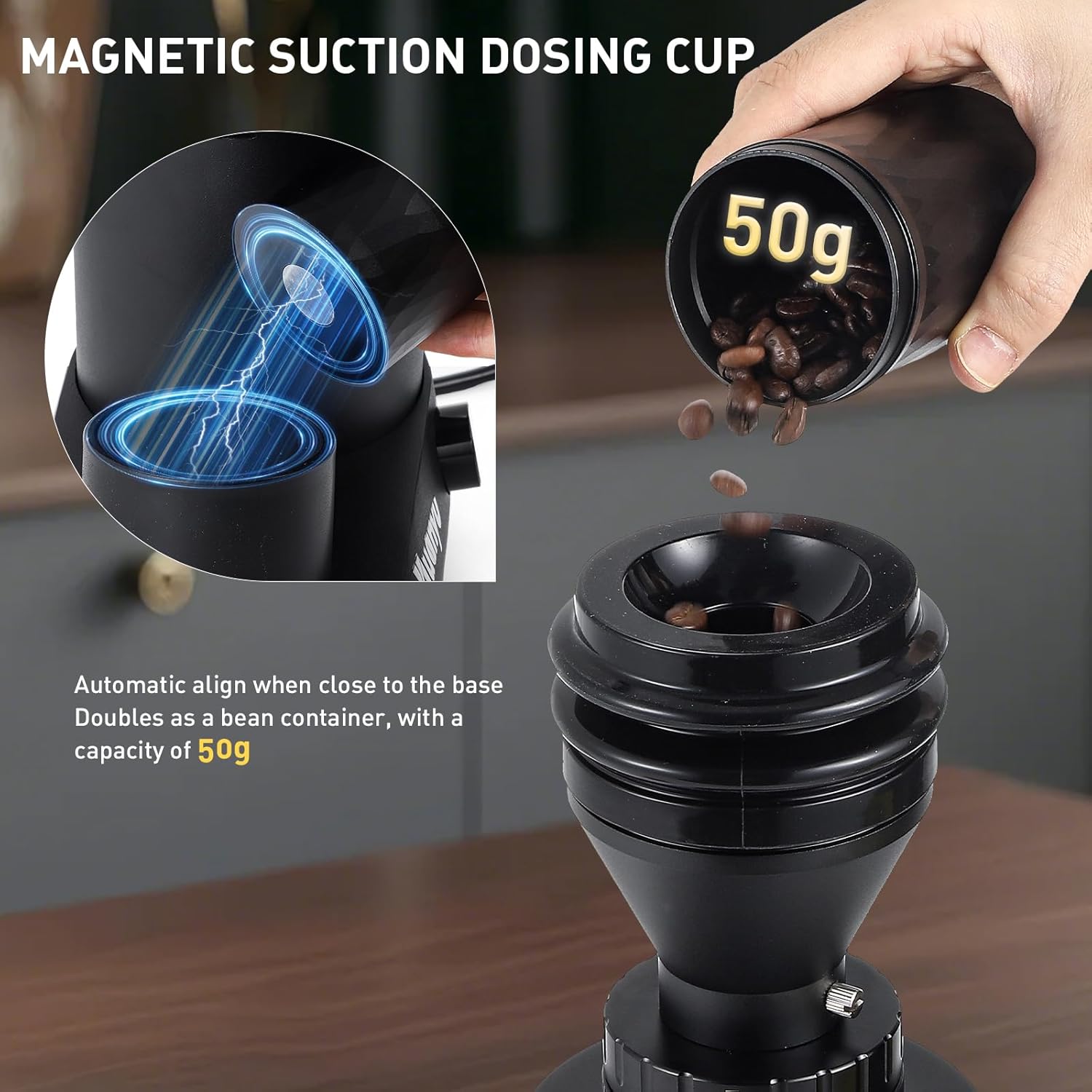 [Magnetic suction dosing cup] Designed to automatically align and secure itself when placed near the base, the dosing cup of our coffee grinder electric keeps your countertop clean and organized. With a capacity of up to 50 g, it doubles as a coffee bean container