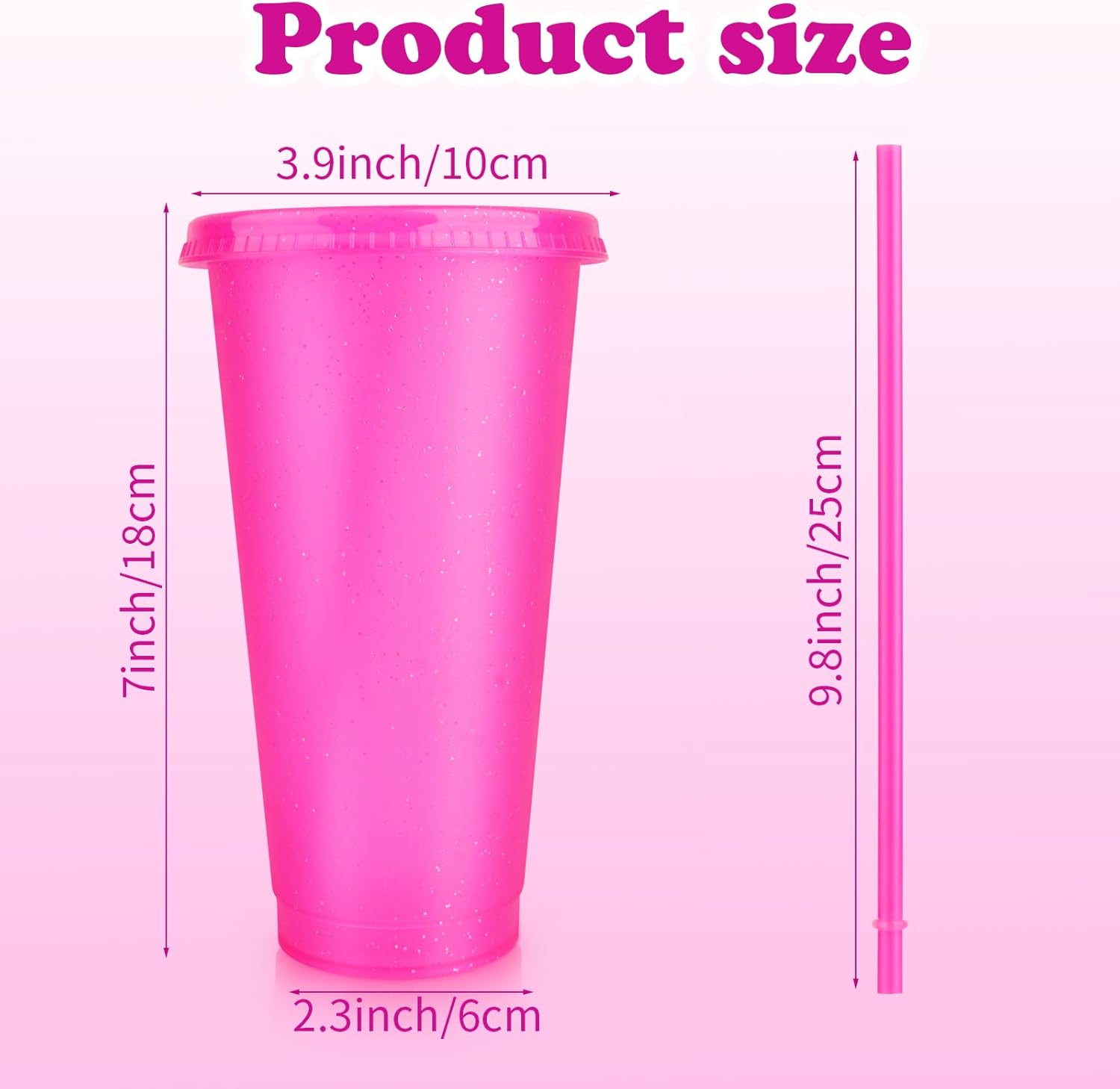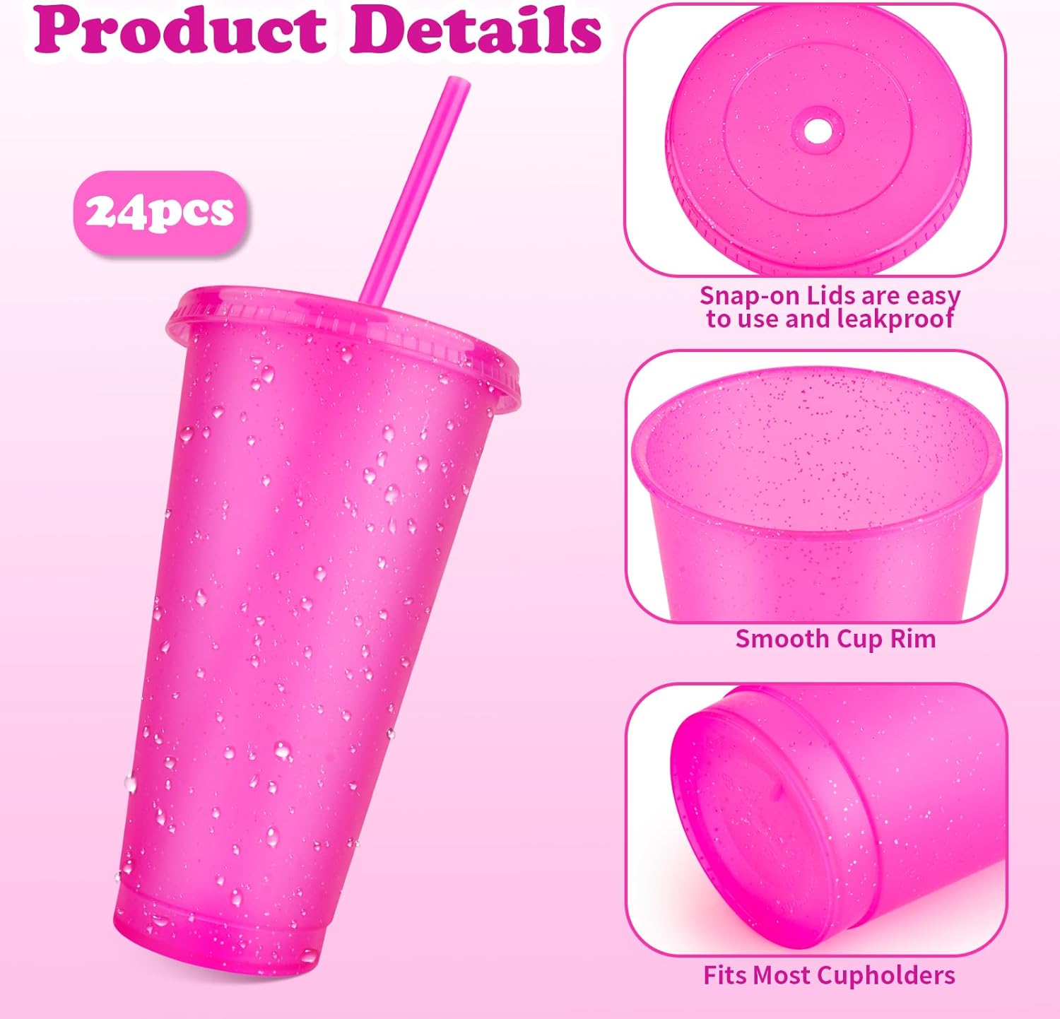 Large Capacity: These glitter reusable cups have a capacity of approximately 24 ounces, which is large enough to hold water, coffee, milkshakes, juices, cocktails, coffee, juices, beverages, smoothies, and other beverages.