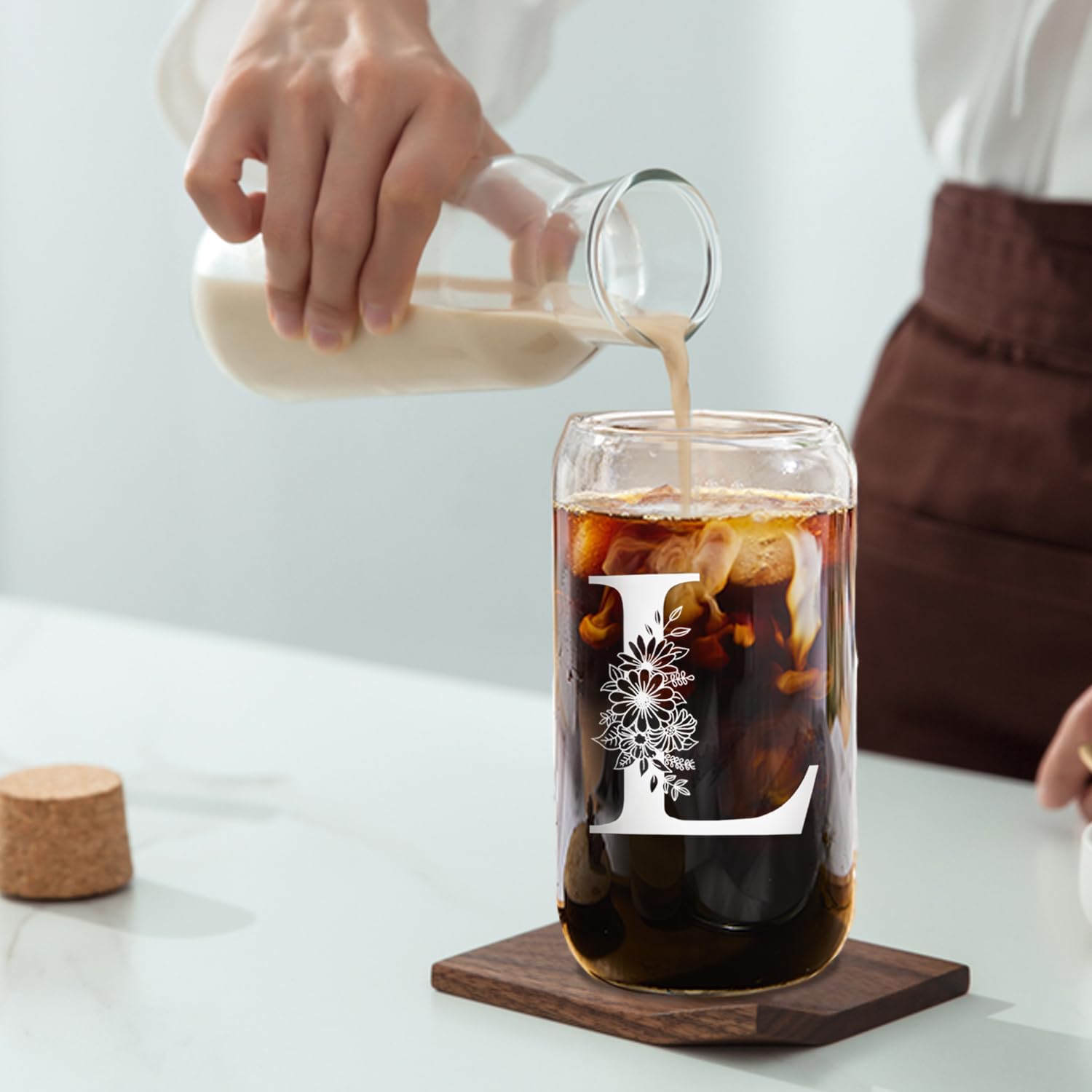 💝[MONOGRAMMED TUMBLER GIFT FOR BEVERAGES]; The iced coffee cup is made of high borosilicate glass, crystal clear and durable.Ergonomic design – thickened glass wall, perfect smooth carafe curvature, details determine the quality. Suitable for coffee, latte, cold brew, smoothies, tea, milk shake, matcha tea, juice, soda, cola, beer, wine, cocktail, margarita, whiskey, water. DIY drink with this glass cup; 16oz large capacity, enough for one taste; It will bring you a newfangled experience every time you create a new drink;