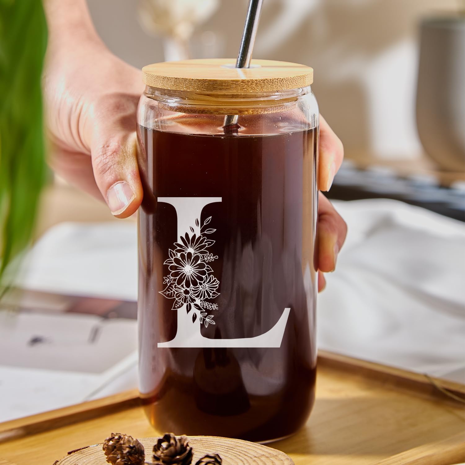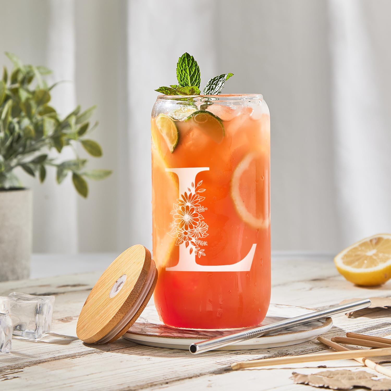 Initial Glass Cup 16oz, Monogrammed Gifts for Women, Glass Can Cup w/Bamboo Lid Straw,Personalized Valentines Mother Day Birthday Gifts for Women, Mom, Wife, Girlfriend, Sister, Friends, L