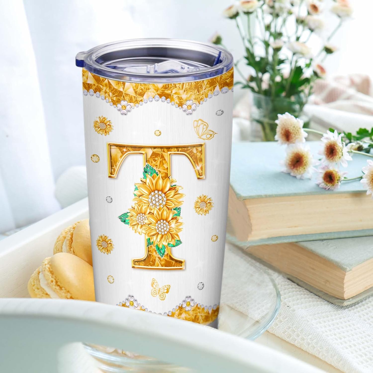 Initial T Tumbler Mug Gifts,Monogrammed Gifts for Women,Personalized Gifts,Personalized Tumbler Cup for Wedding Birthday Graduation Party,Unique Initial Sunflower Gifts for Women Her Mom Teacher 20oz