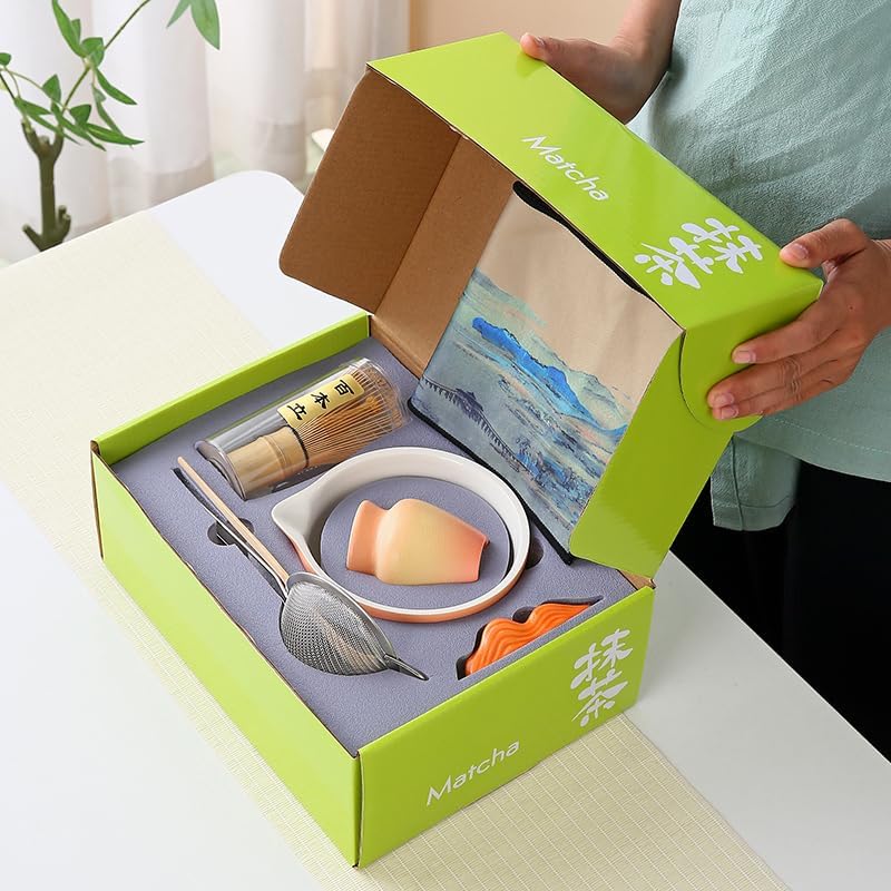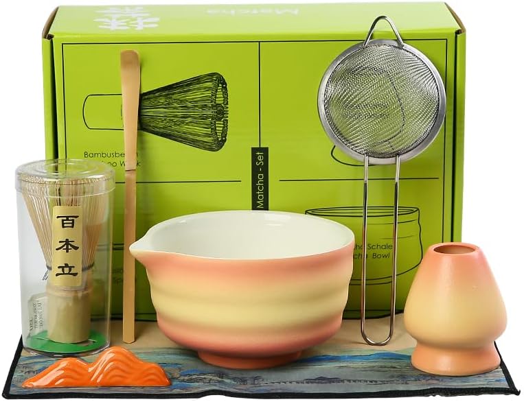 Japan Matcha Set Matcha Whisk Matcha Bowl with Pouring Spout Scoop Matcha Whisk Holder Tea Making Kit. 1 Japanese Tea Set,Matcha color,Color Box Packing, 15.2 ounce 7pcs