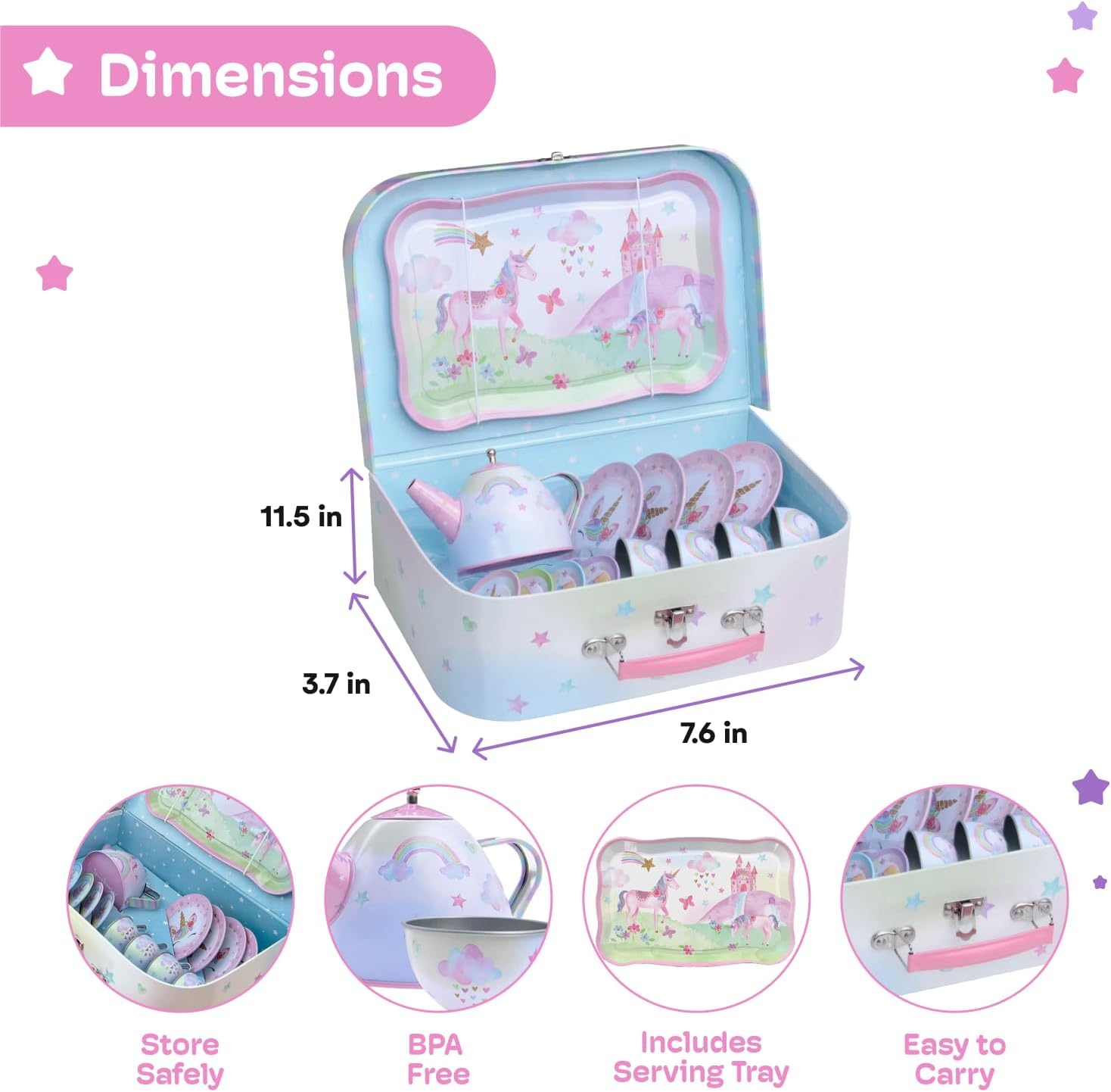 Jewelkeeper 15-Piece Tea Party Tin Tea Set for Toddlers – Kids Pretend Toy Tea Set with Carrying Case – Picnic Toys for Toddler – Unique Gift for Kids and Girls – Unicorn Tea Set Toy for Fun Play