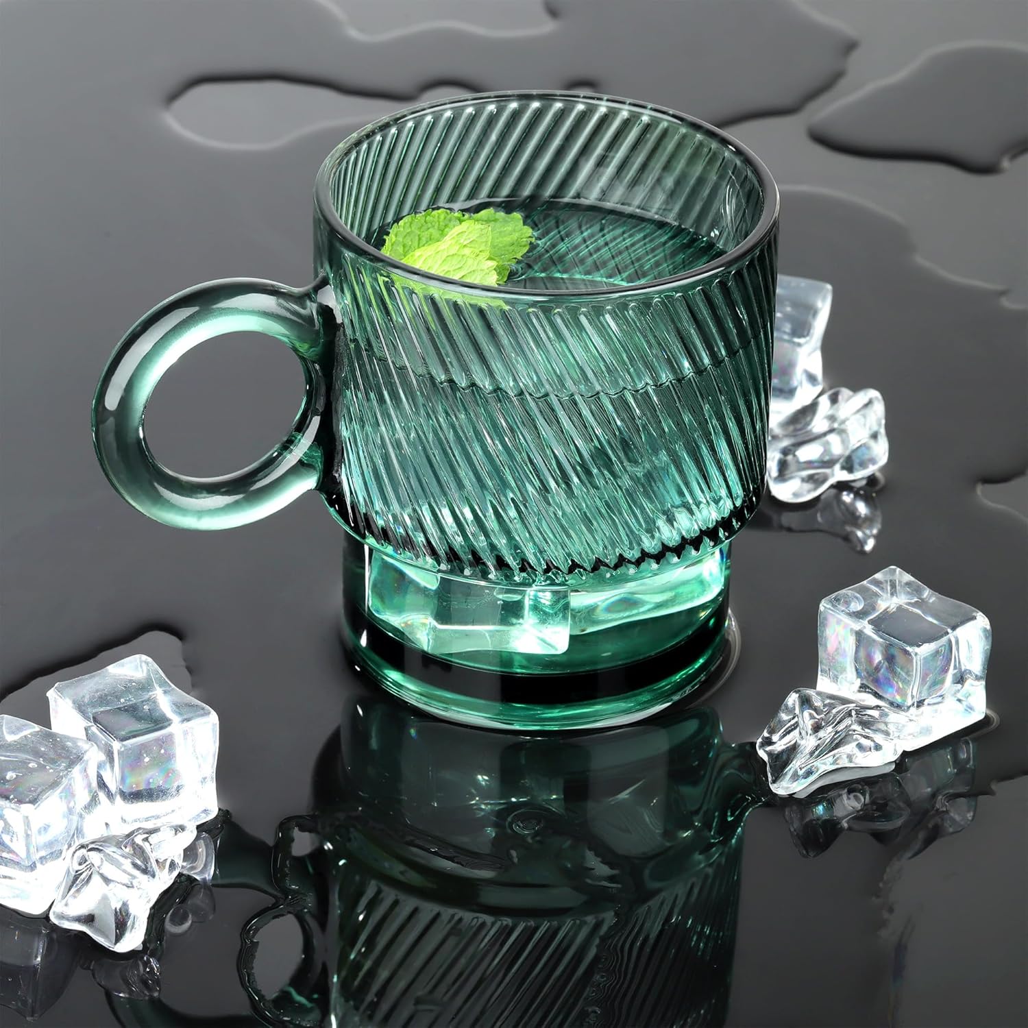 Welcome to Joeyan Glassware Collection. 10oz Stackable Green Colored Glass Mug for Various Drinkings. Lead Free and Sturdy Materials. Dishwasher Safe.