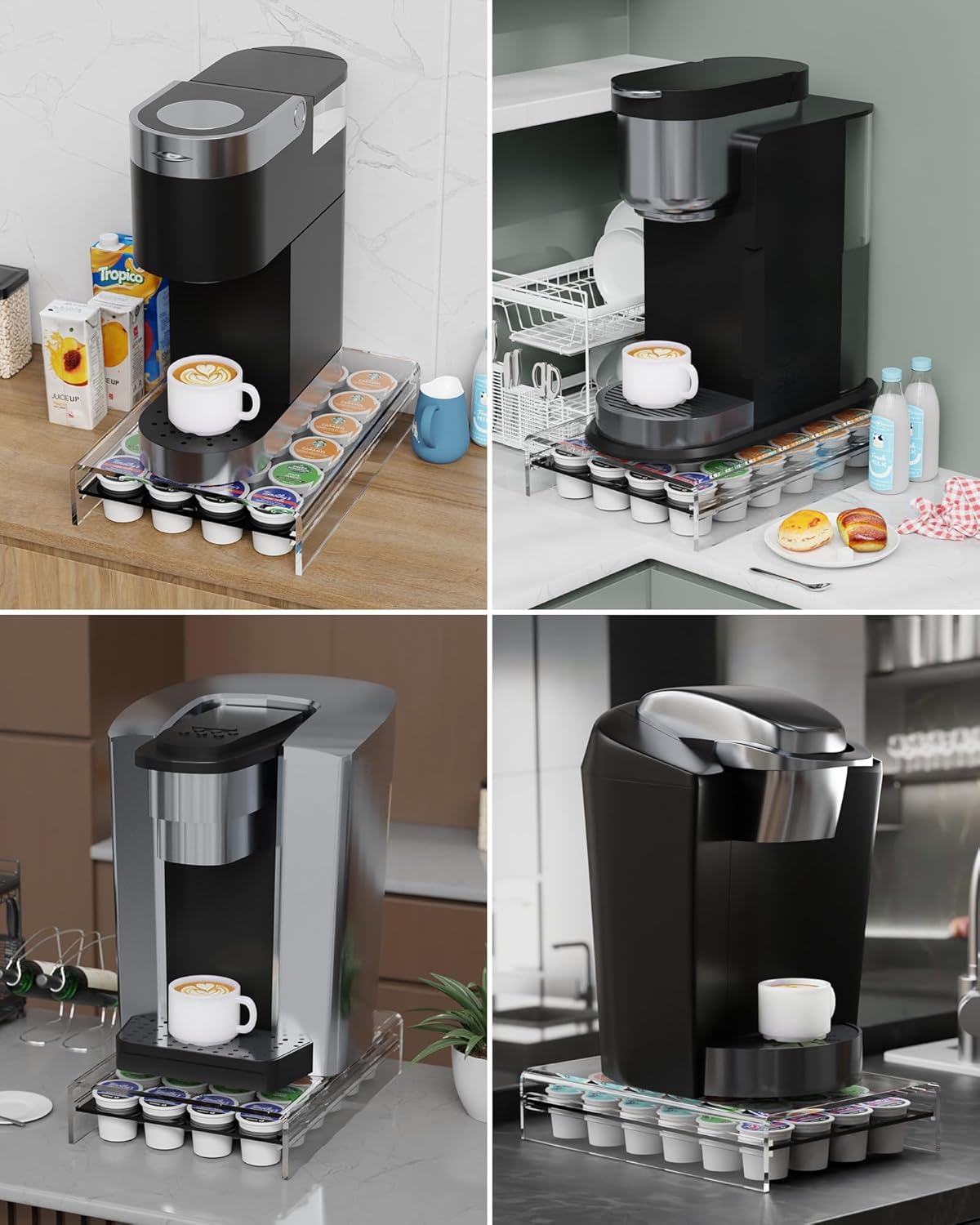 THICKENED SHELL: Our K Cup drawer is made of acrylic, the texture between glass and crystal, beautiful, elegant, the top load capacity is up to 22lbs, easily put down your coffee maker, no need to worry about deformation or fragility, even if you accidentally drop it, not affect!